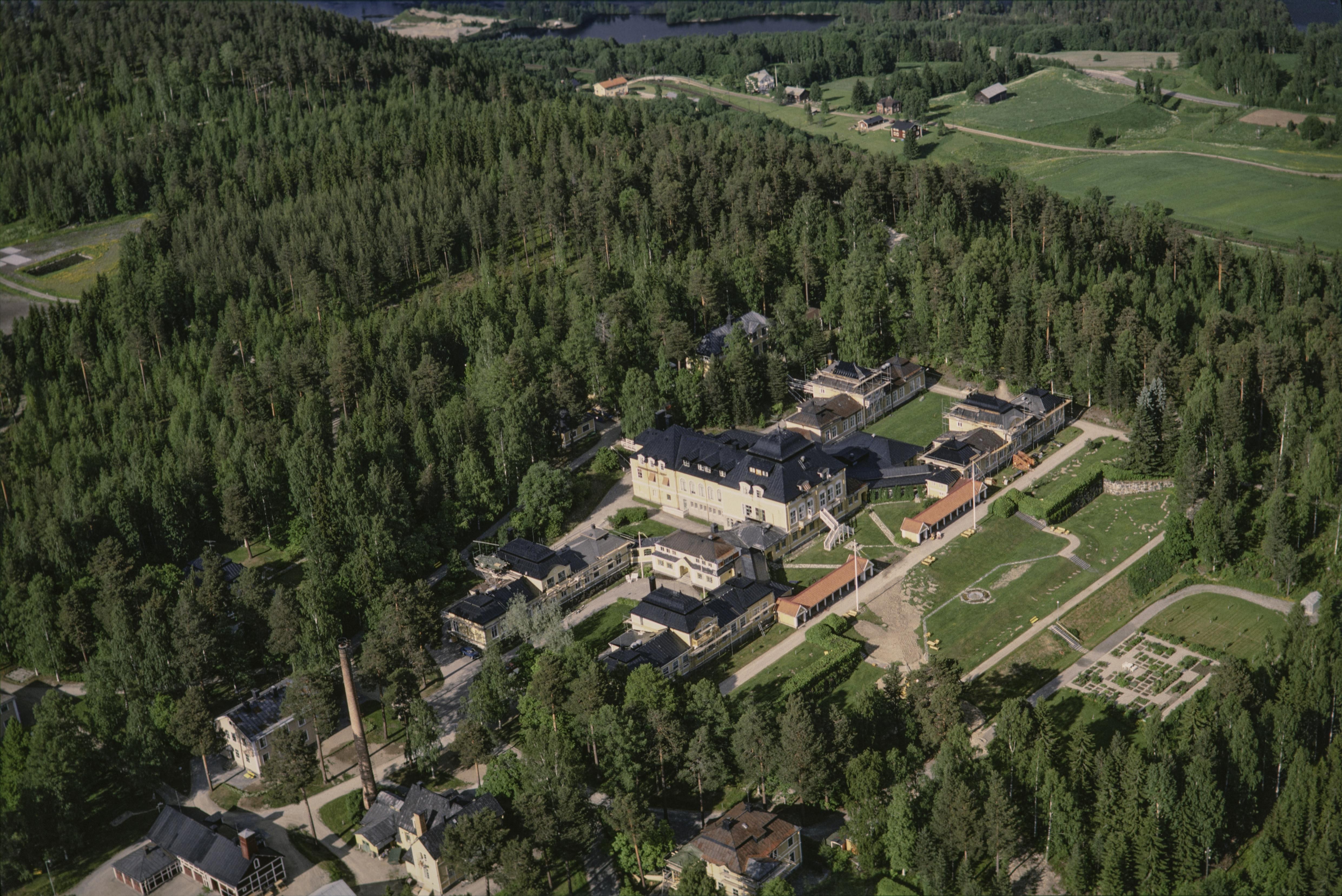 Beskrivning: Byggnadsminnet Österåsens sanatorium och minnesstenen RAÄnr Ed 81:1 norr i orten Österås där Ångermanälven och Faxälven möts. Bilden är tagen mot (väderstreck): NO