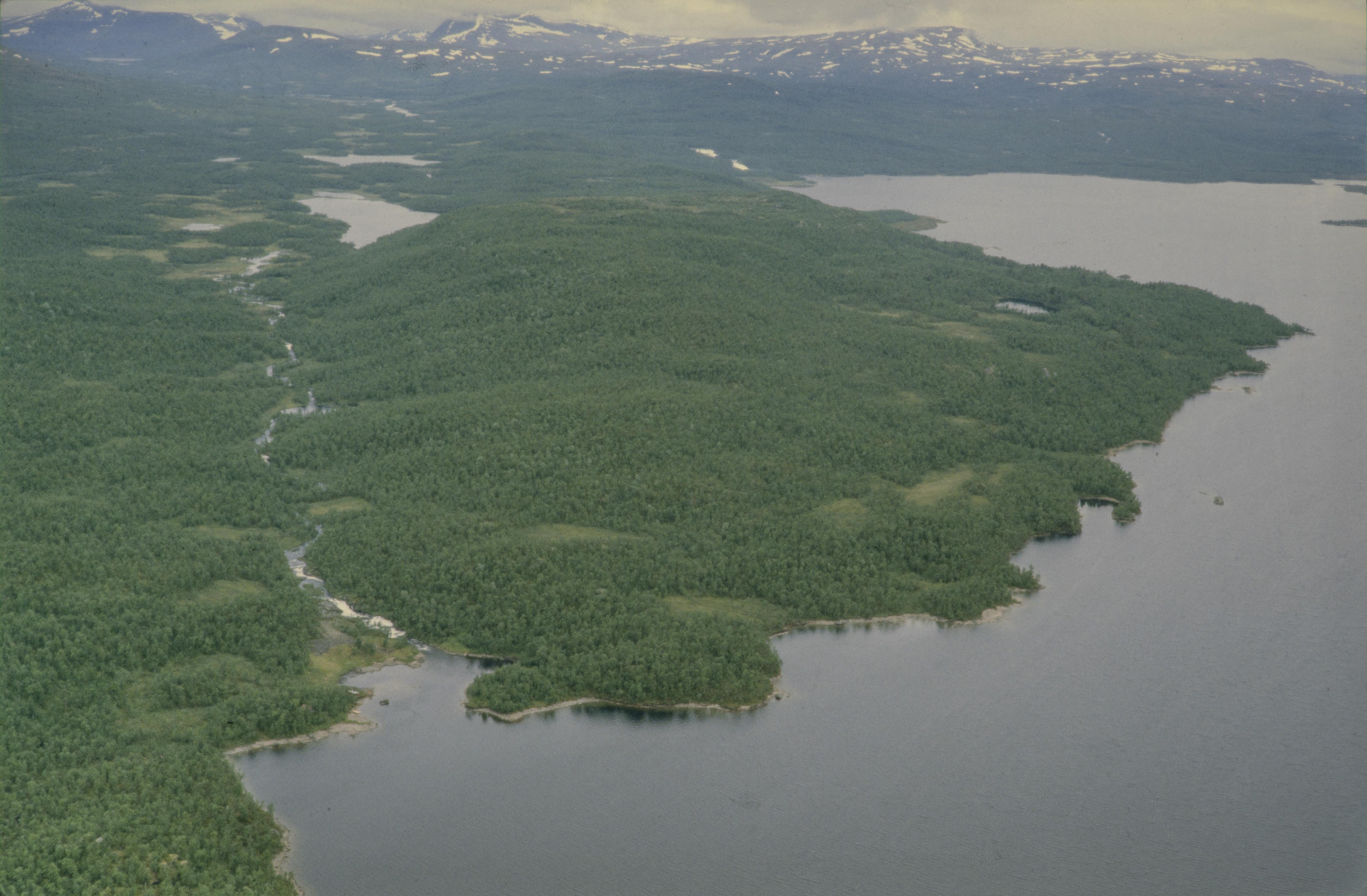 Beskrivning: Dalgången vid Silbojokks silverhytta i nordvästra ändan av sjön Sädvajaure (Sädvvájávrre). Nere till vänster utloppet av ån Silbojokk (Silbbajåhkå). Vid utloppet hyttlämningar efter Nasafjälls silververk RAÄnr Arjeplog 368:1, boplats Arjeplog 296:1 och begravningsplats Arjeplog 4232. Bilden är tagen mot (väderstreck): NV