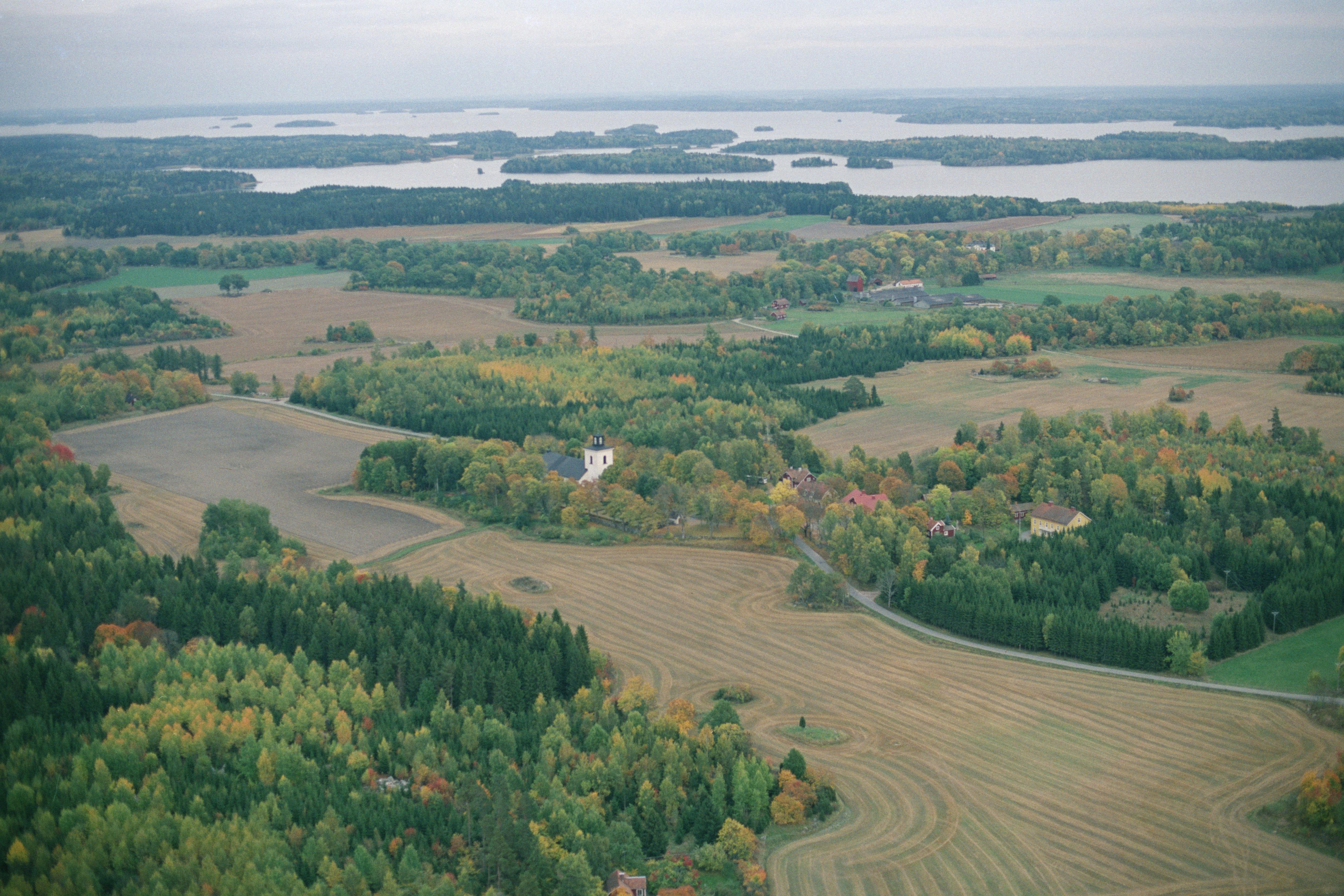 Beskrivning: Rytterne kyrka RAÄnr Rytterne 140:1 vid bildens mitt. I bildens övre del fjärden Lilla Blacken i Mälaren. Bilden är tagen mot (väderstreck): Ö