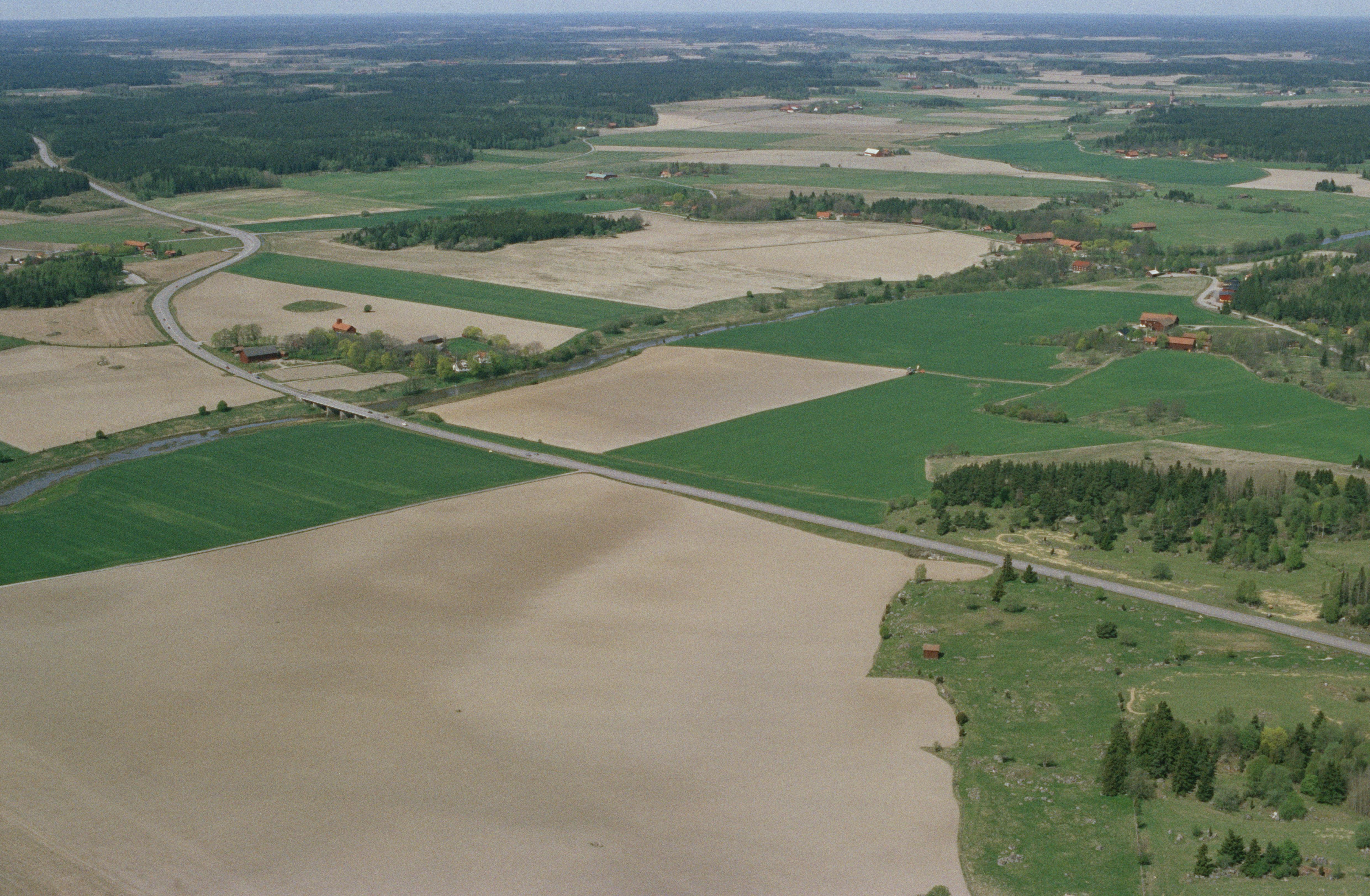 Beskrivning: Sagån markerar gränsen mellan Tillinge socken i landskapet Uppland i riksintresset U28 (i bildens nedre del) och Björksta socken i landskapet Västmanland i riksintresset C55 (i bildens övre del). Nere till höger Stensborg och gravfält med hällristningar RAÄnr Tillinge 2:1-2, 187:1 m.fl. Över bildens mitt Östanbro med Kung Östens hög RAÄnr Björksta 106:1 i Björksta socken, Västmanland. Bilden är tagen mot (väderstreck): NV