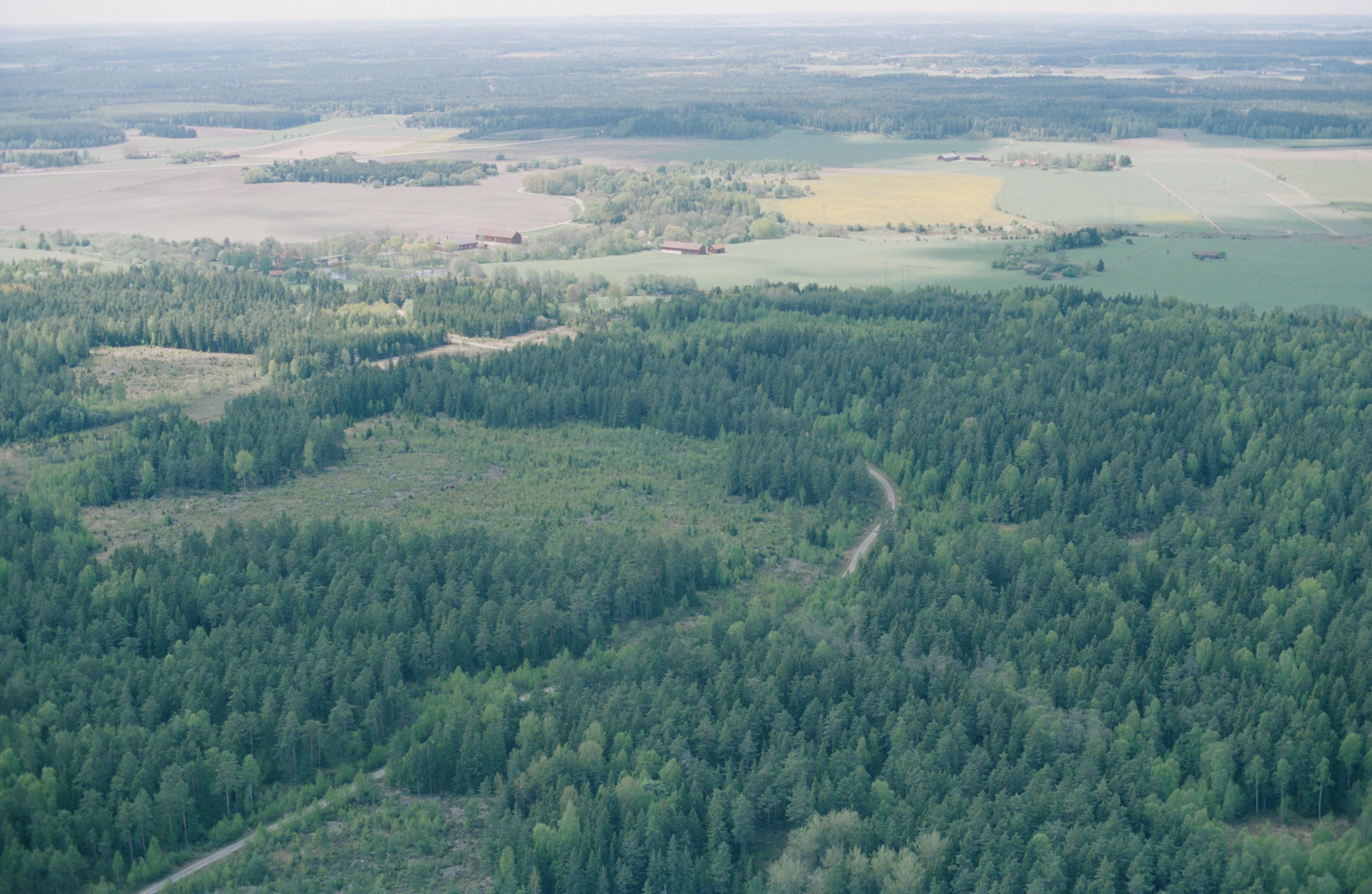 Beskrivning: Över bildens mitt Nykvarn och Östanbro där Lillån och Sagån möts. Sagån markerar gränsen mellan Tillinge socken i landskapet Uppland i riksintresset C55 (i bildens nedre del) och Björksta socken i landskapet Västmanland i riksintresset U28 (i bildens övre del). Till vänster över bildens mitt Ekensbergs by och Blotsvens hög RAÄnr Tillinge 33:1-3. Bilden är tagen mot (väderstreck): SV