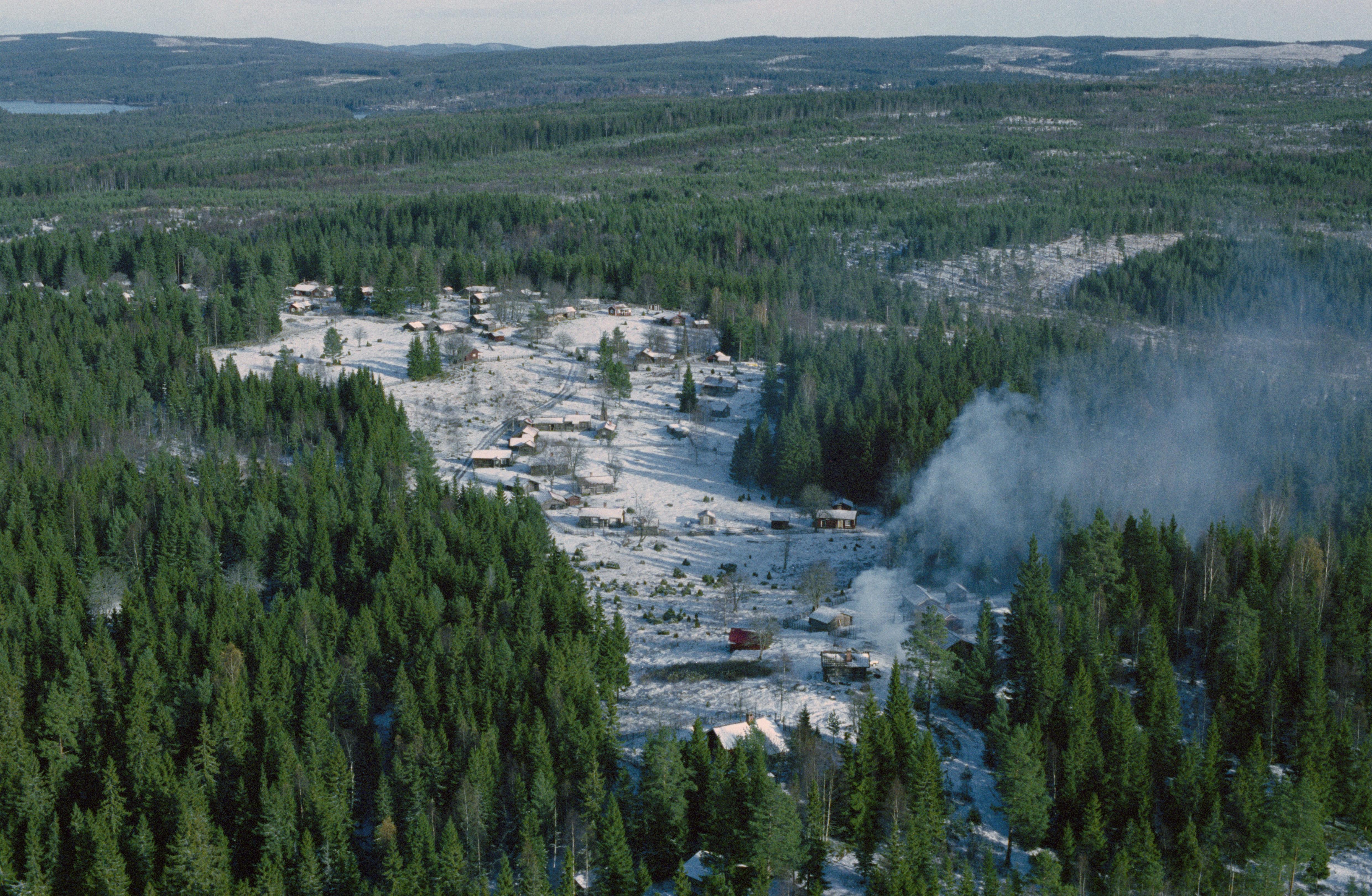 Beskrivning: Bastbergets fäbodmiljö RAÄnr Gagnef 39:1. Vid bildens mitt fäbodar med nummer 101, 103, 105 m.fl. i södra delen av byn. Bilden är tagen mot (väderstreck): NO
