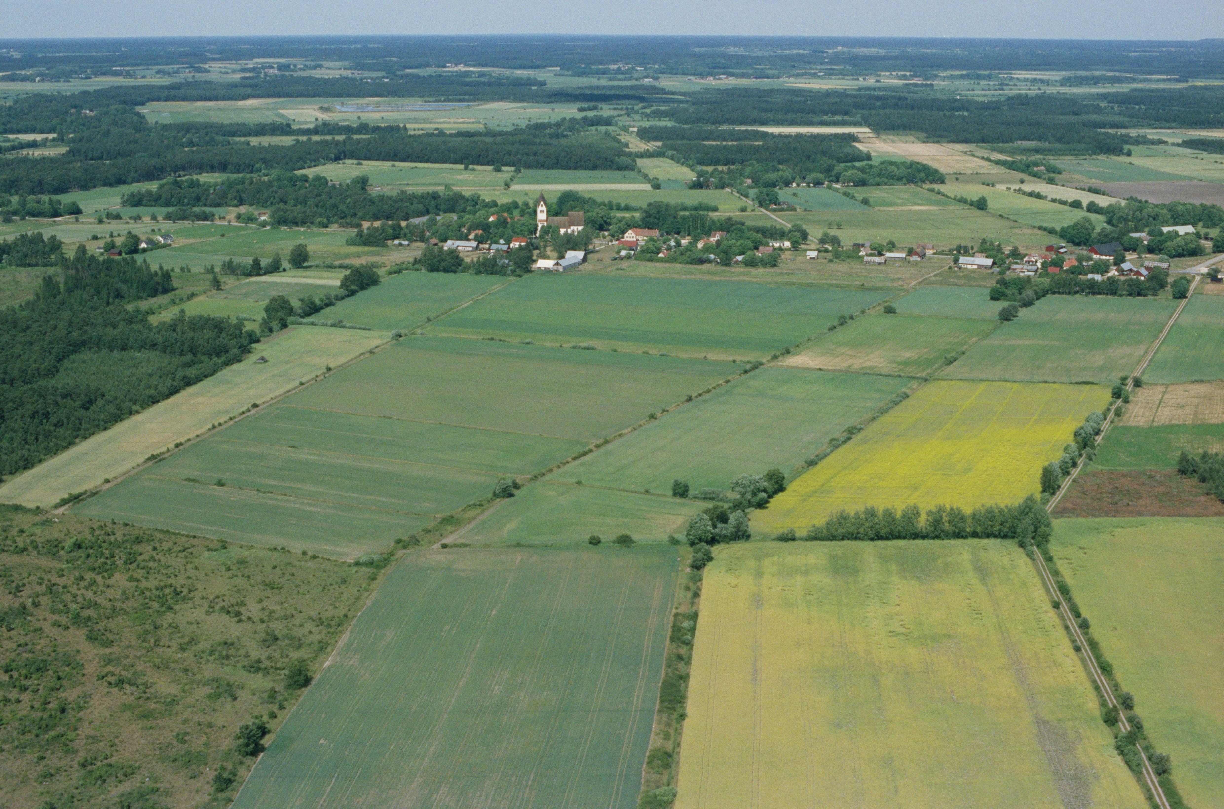 Beskrivning: I bildens nedre del området väster om Sigdes by. Bandlunde kyrka och kyrkby till vänster över bildens mitt. Vid bildens mitt område med tjärdal/tjärgrop RAÄnr Burs 113:1. Bilden är tagen mot (väderstreck): N