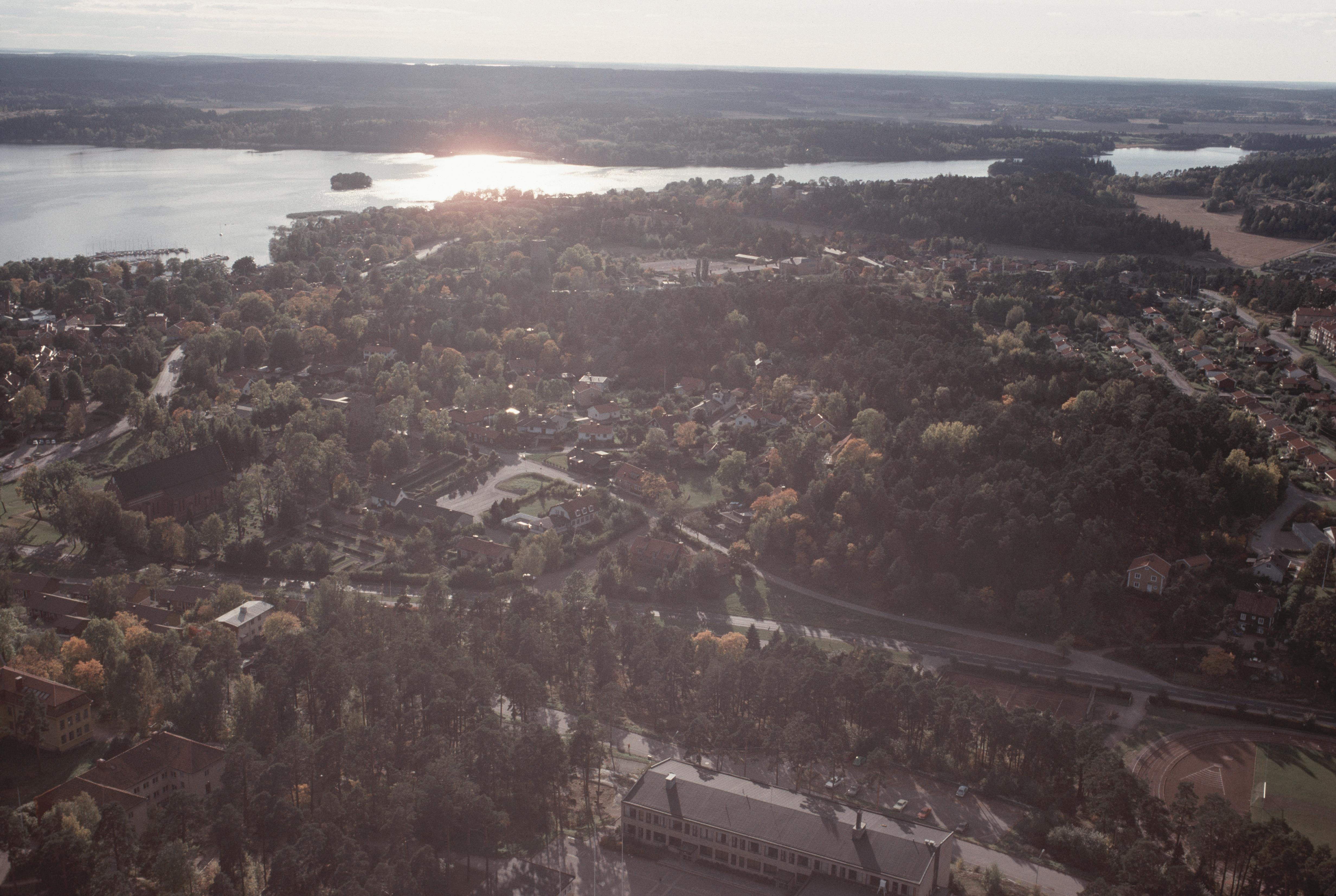 Beskrivning: Sigtuna stad vid Sigtunafjärden i Mälaren. Mariakyrkan till vänster om bildens mitt. Till höger fornborg Trollberget RAÄnr Sigtuna 80:1. Bilden är tagen mot (väderstreck): SV