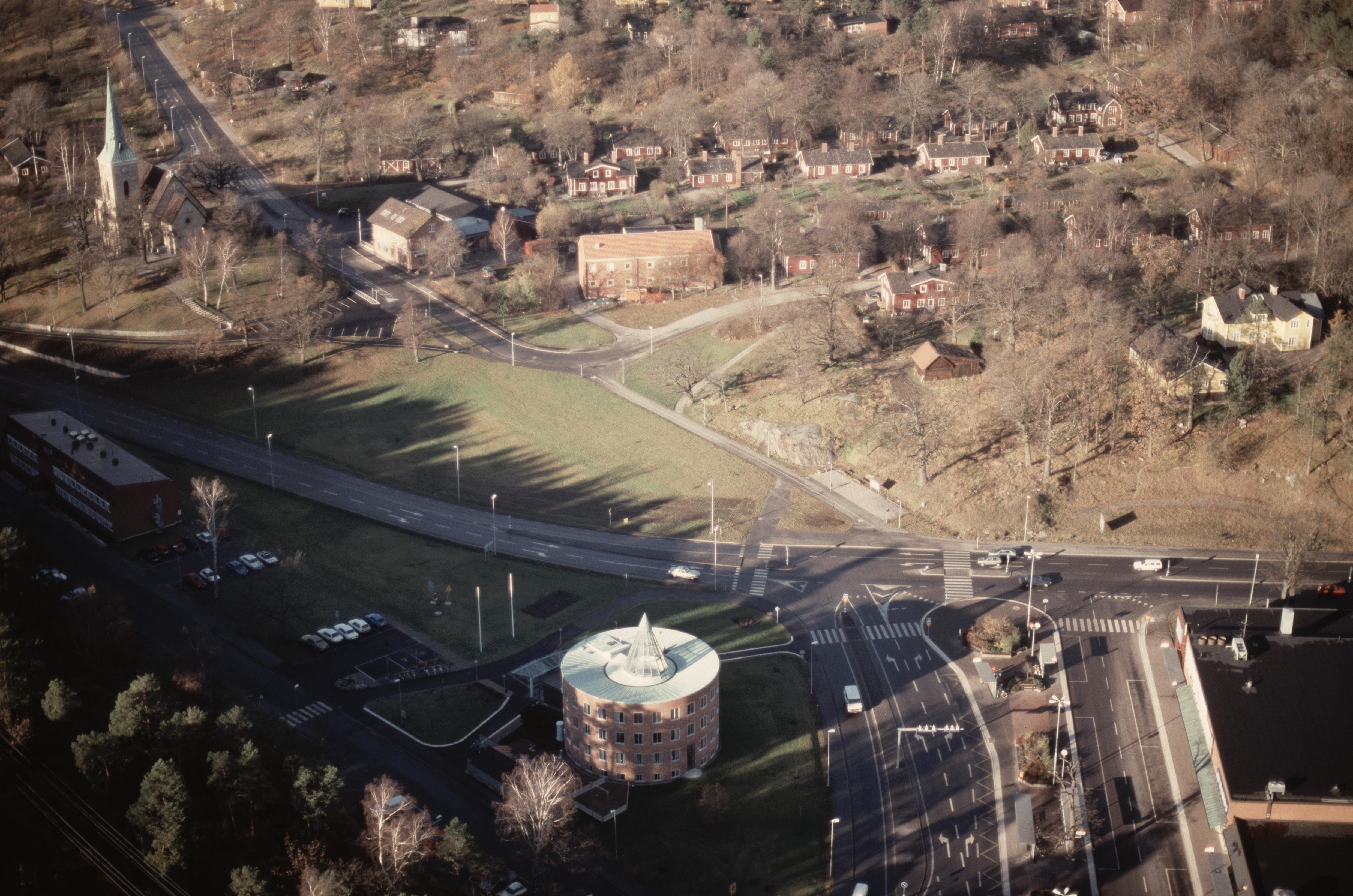 Beskrivning: Gustavsbergs tätort. "Runda huset" i bildens nedre del. Uppe till vänster Gustavsbergs kyrka. Till höger i bildens övre del arbetarbostäder för porslinsfabriken, Grindstugatan RAÄnr Gustavsberg 36:1 med byggnaden Gamla apoteket. Till höger om bildens mitt Värmdögatan. Bilden är tagen mot (väderstreck): NV
