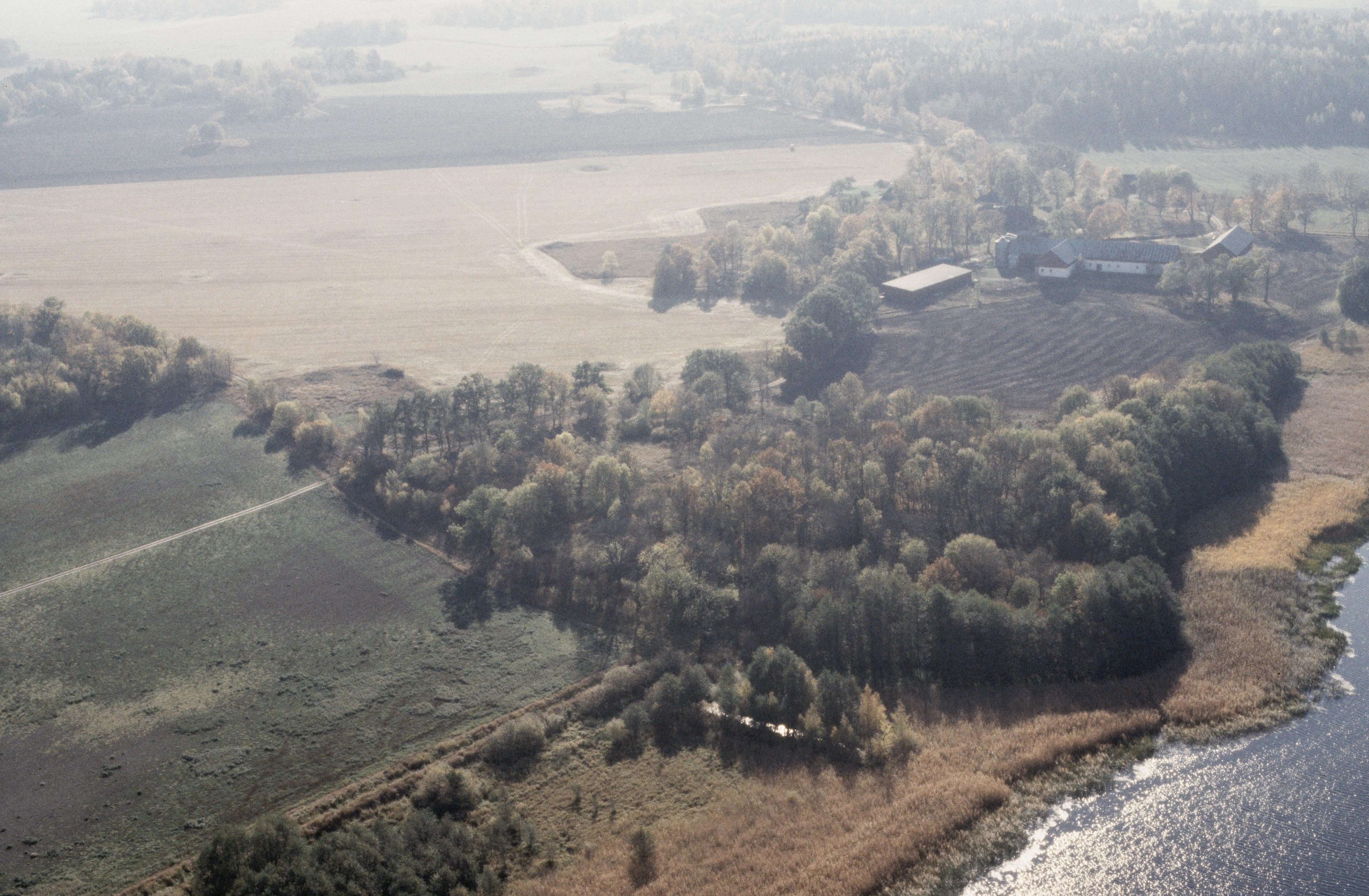 Beskrivning: Nere till höger Ängsösund i Mälaren mellan Oxfjärden i öster och Kungsårafjärden i väster. Uppe till höger Kuröns herrgård i storgårdstomt RAÄnr Ängsö 157. Bilden är tagen mot (väderstreck): S