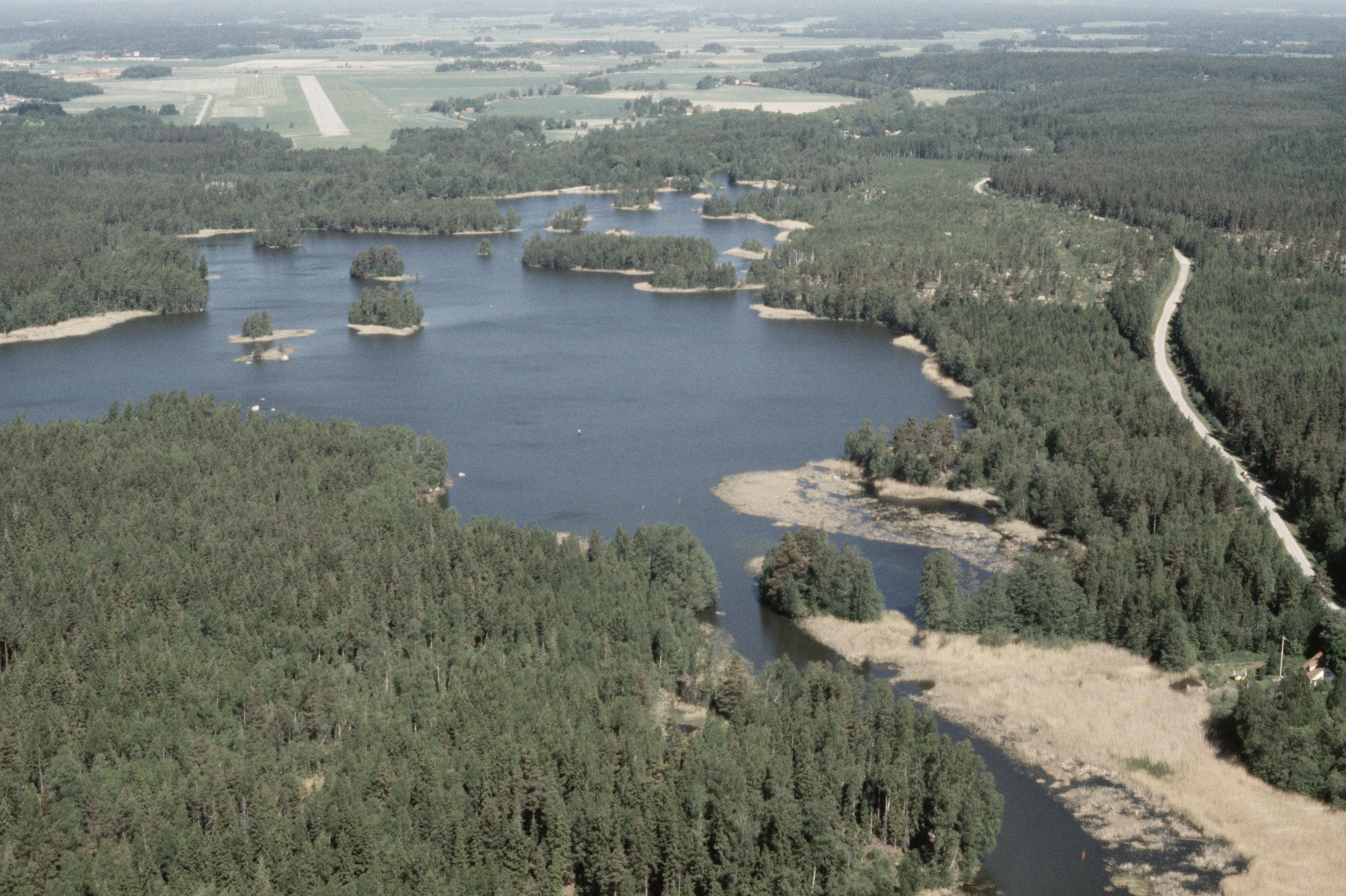 Beskrivning: Hjälmare kanal vid Kvarnsjön. Nere till höger torpet Skogstorp. Vid bildens mitt stensättning RAÄnr Säterbo 23:1 i vattnet. Uppe i bildens vänstra kant området Hällby kvarn och Arboga flygfält vid Säterbo. Bilden är tagen mot (väderstreck): NNV