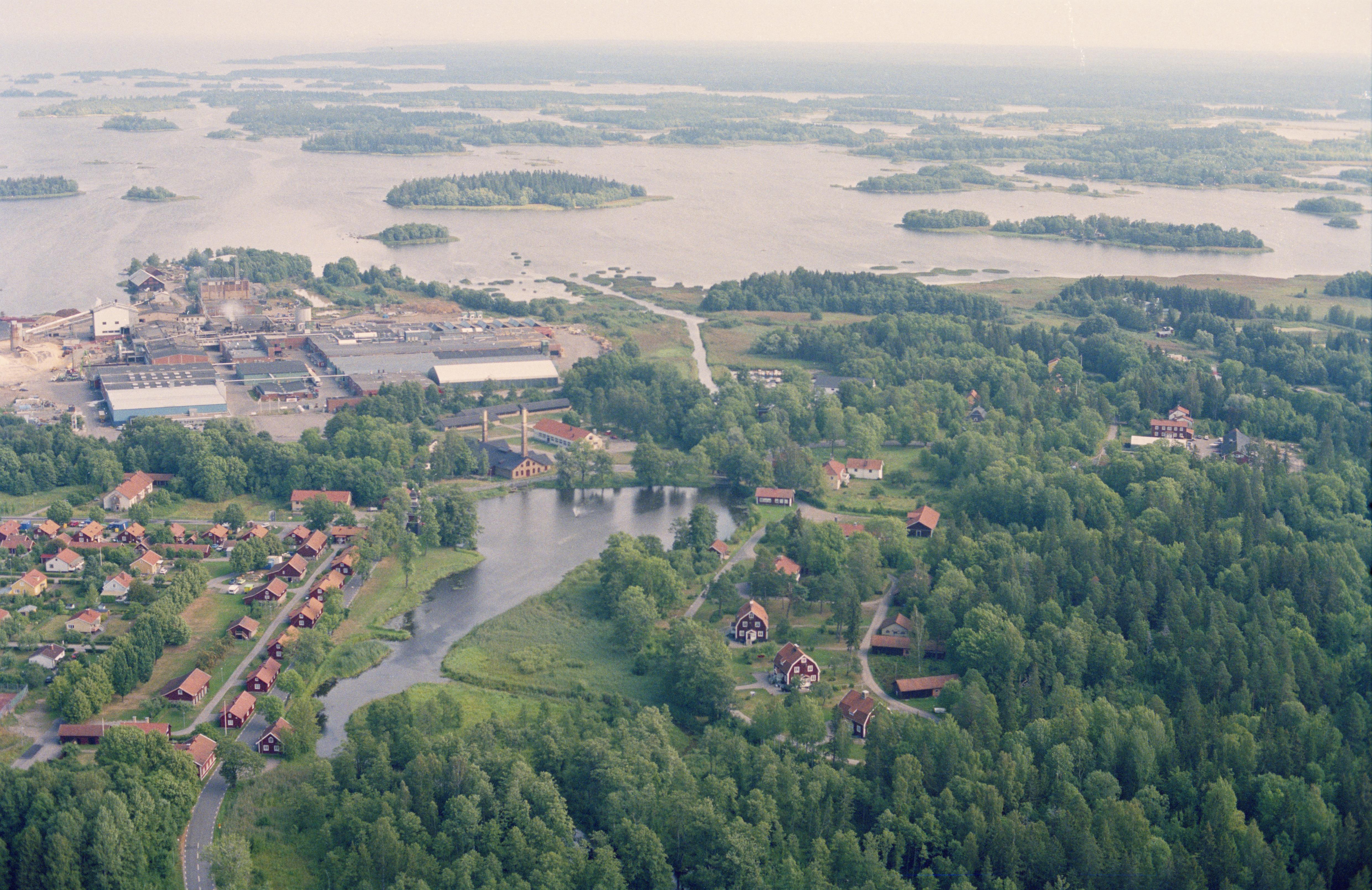 Beskrivning: Karlholmsbruk (skrivs även Karlholms bruk) vid Storån i tätorten Karlholm. Byggnadsminnen hammare och smedja RAÄnr Västland 332 vid brukssjön Dammen. Karlholmsfjärden i bildens övre del. Karlholms kyrka till höger över bildens mitt. Bilden är tagen mot (väderstreck): NO