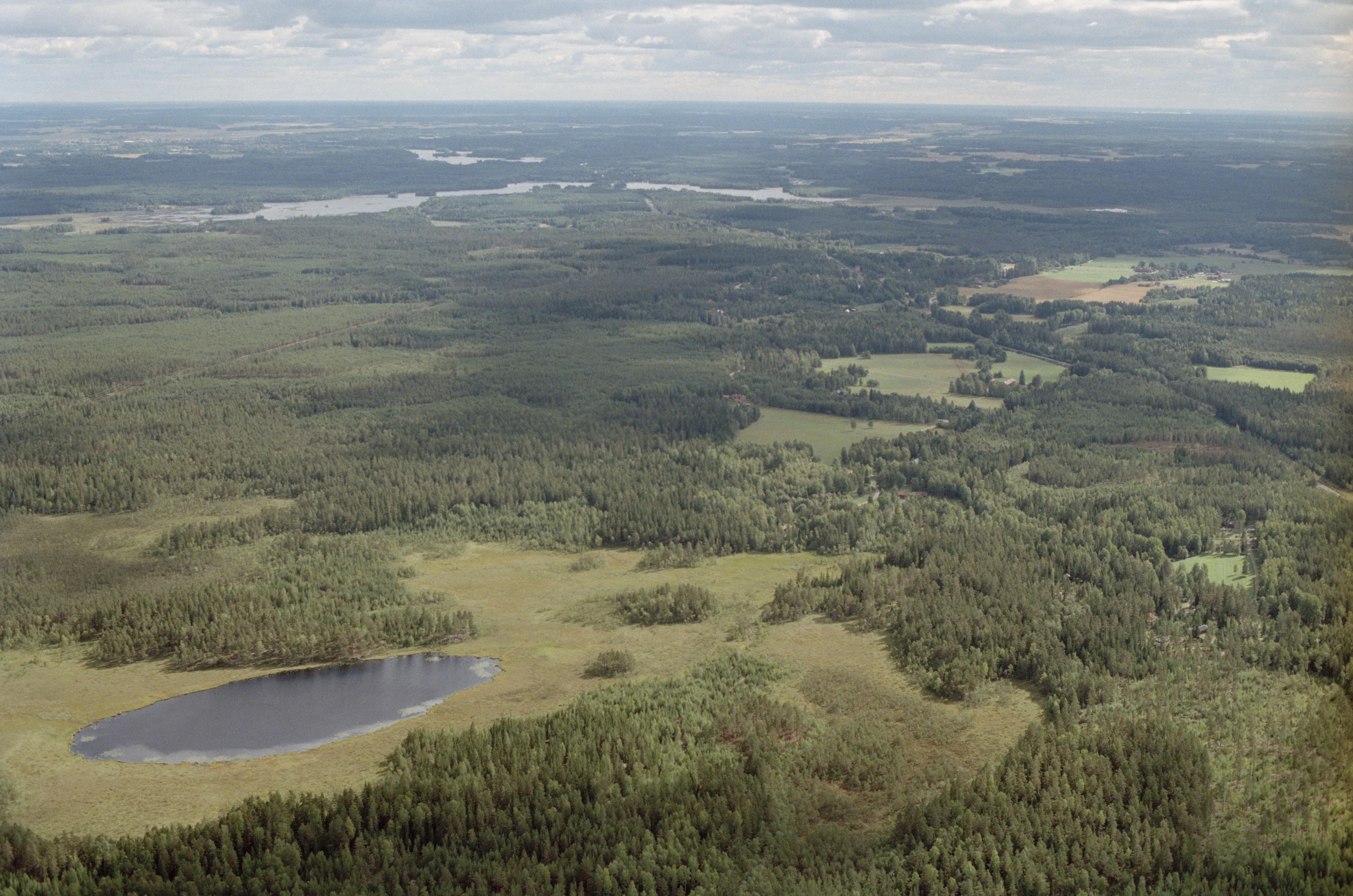 Beskrivning: Storljusbäckens dalgång norrost om Rensmurs by. Björksjön i Björksjö mosse nere till vänster. Under bildens mitt kolningsanläggningar RAÄnr Möklinta 298:1 och 333;1. Vid bilden mitt gräns mot Sala stads socken och Sala socken. I bildens övre del Sala gruvdammar Olof-Jons damm och Silvköparen. Bilden är tagen mot (väderstreck): SO