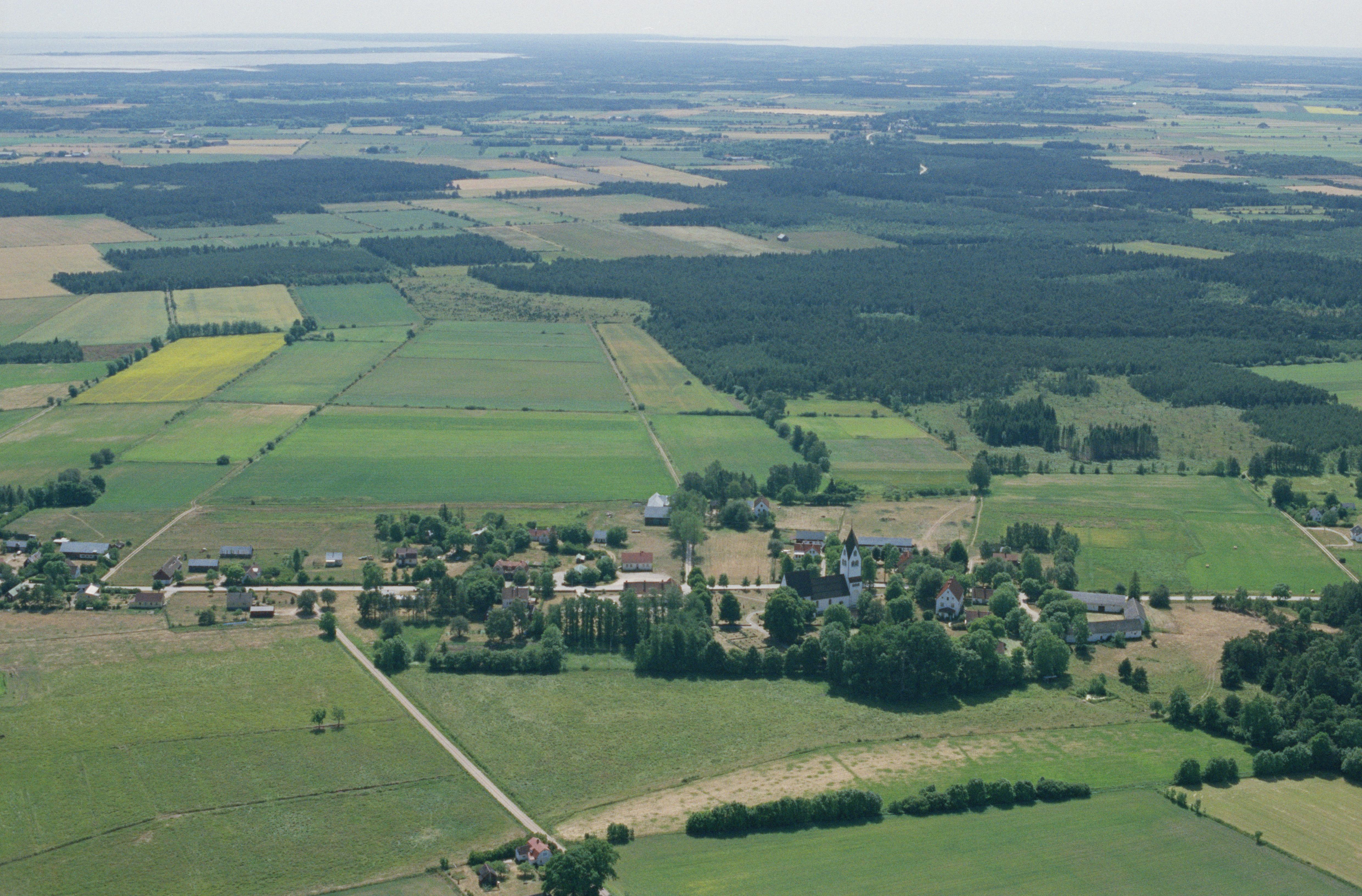 Beskrivning: Burs kyrka och kyrkby. Vid kyrkan grav RAÄnr Burs 166:1. Rone socken m.fl. i bildens övre del. (Bilden tillhör även Riksintresse-nr I37 - Bandlunde.) Bilden är tagen mot (väderstreck): SSV
