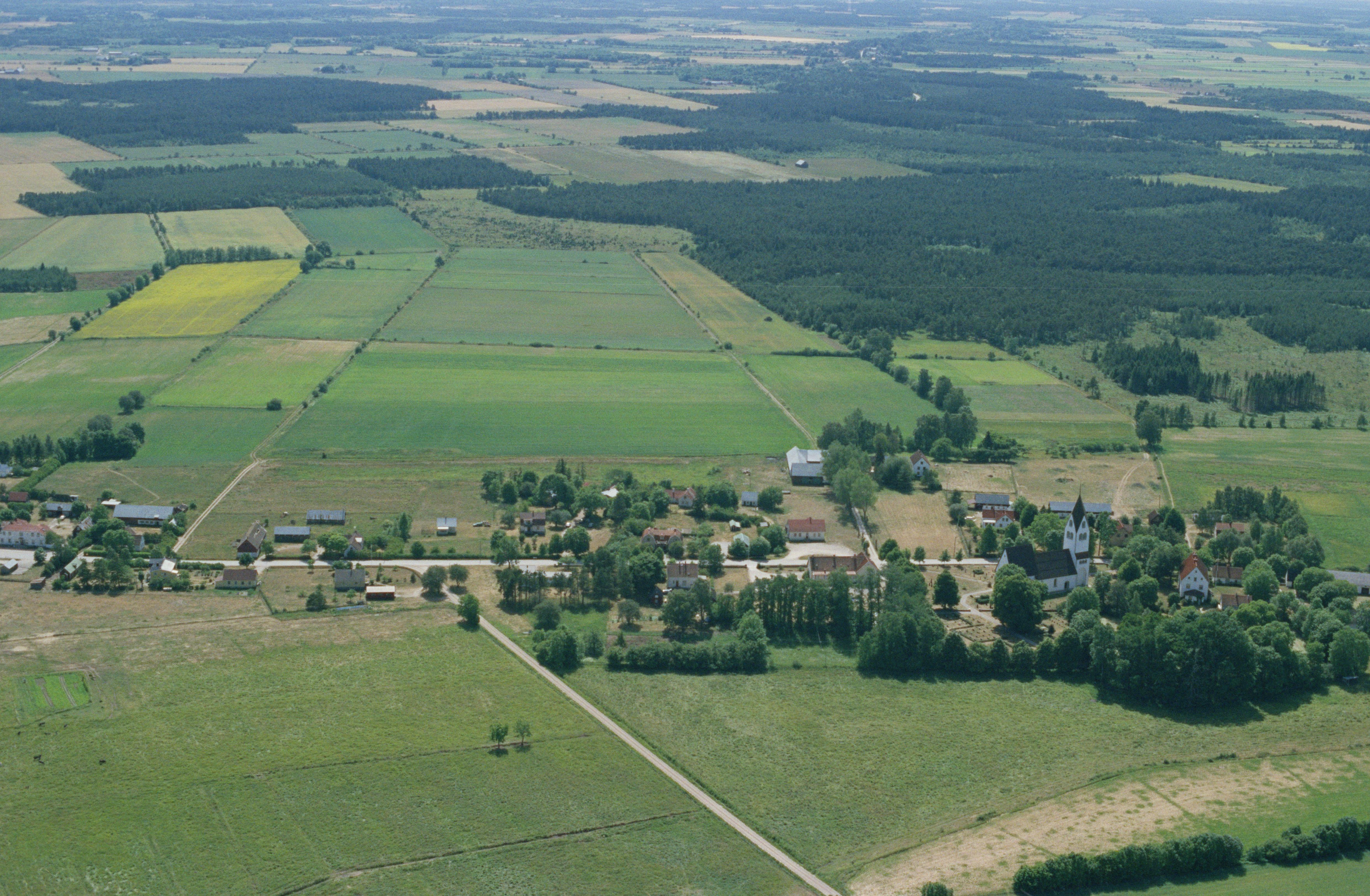 Beskrivning: Burs kyrka och kyrkby. Vid kyrkan grav RAÄnr Burs 166:1. Rone socken m.fl. i bildens övre del. (Bilden tillhör även Riksintresse-nr I37 - Bandlunde.) Bilden är tagen mot (väderstreck): SSV
