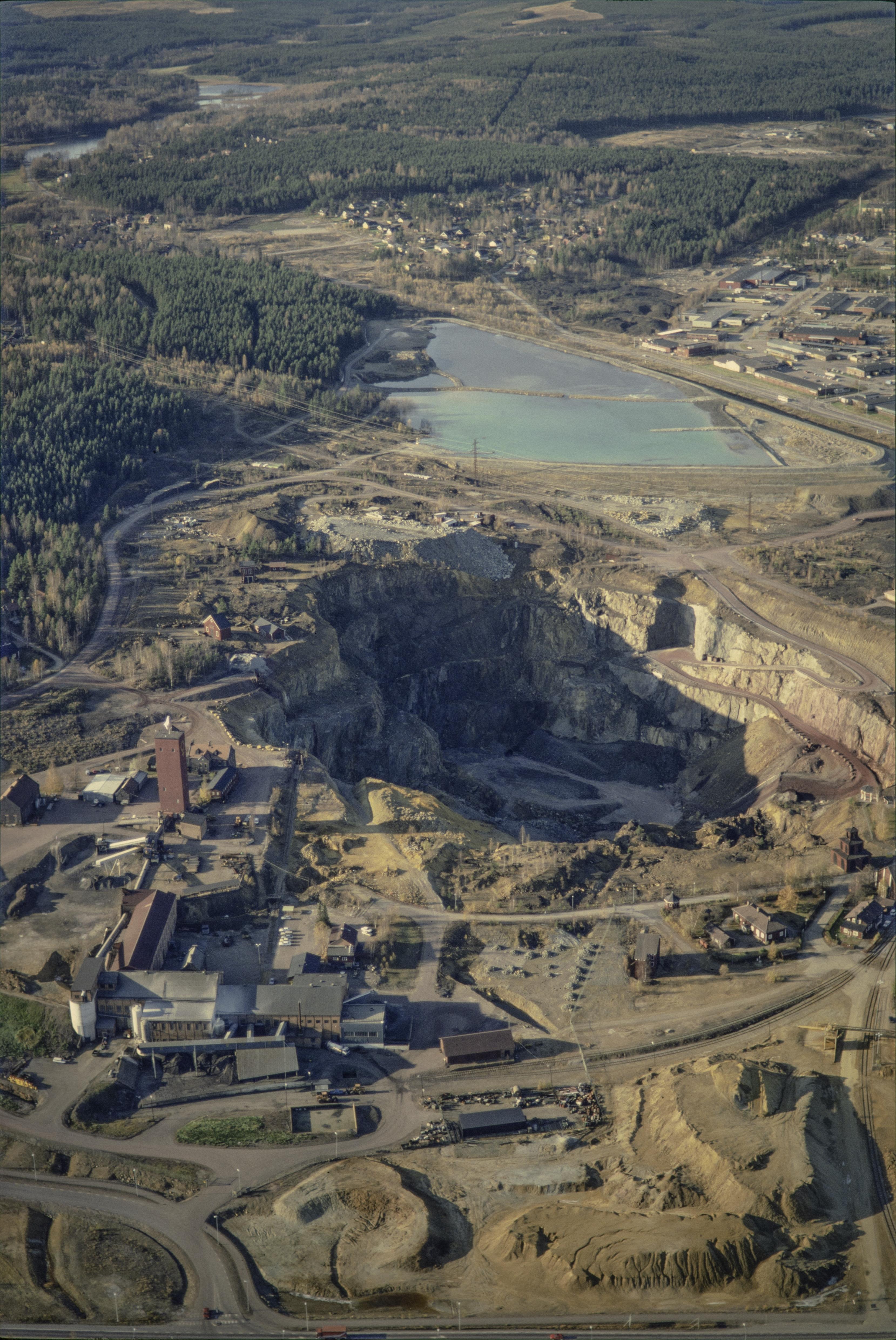 Beskrivning: Gruvhålet Stora Stöten RAÄnr Falun 17:1 i Falu koppargruva sydväst i Falu stad. Gamla Bergsdammen i bildens övre del. Bilden är tagen mot (väderstreck): V