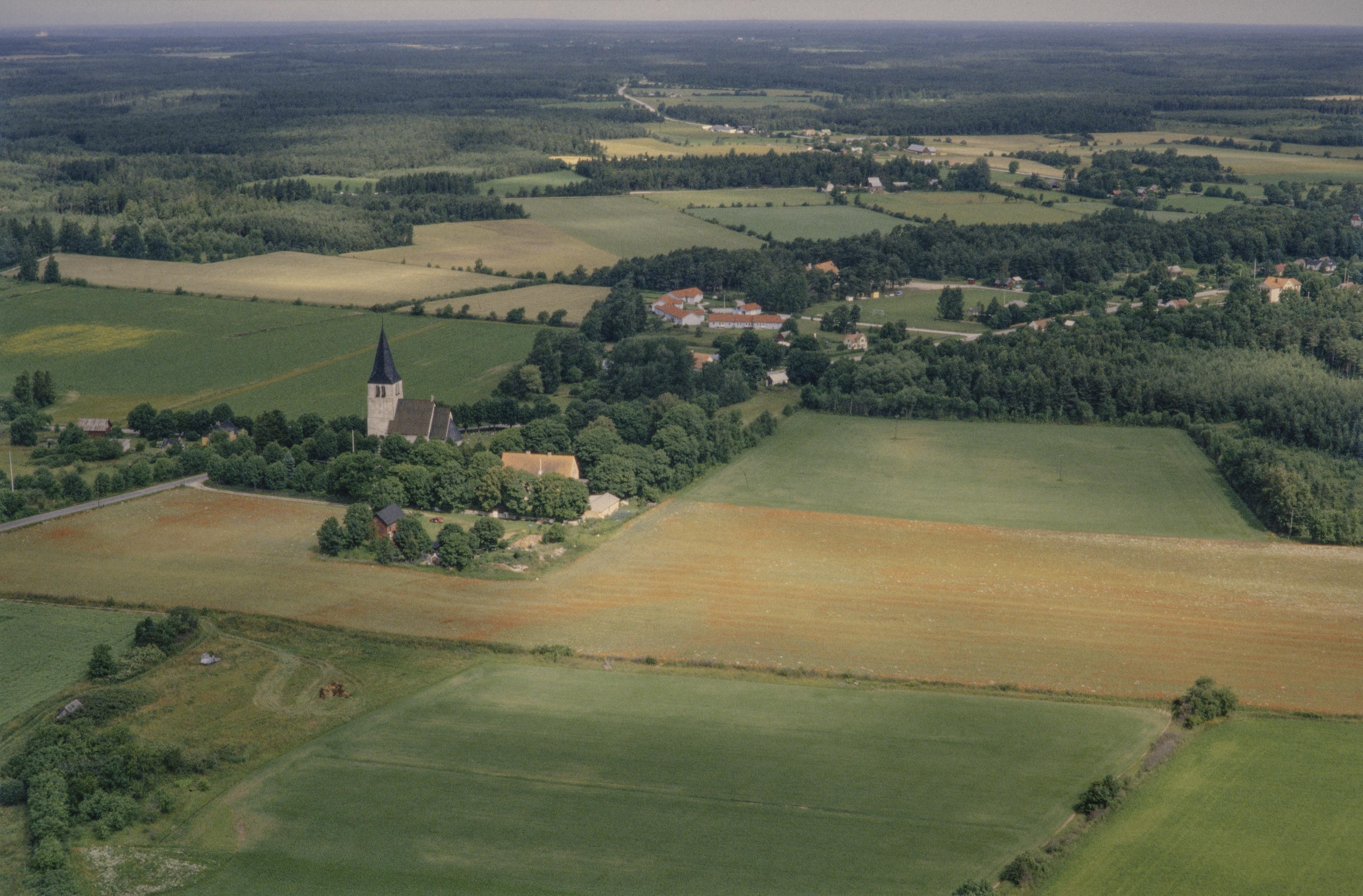 Beskrivning: Levide kyrkby. Levide kyrka till vänster om bildens mitt. I kyrkan runristningar RAÄnr Levide 73:1-2. Bilden är tagen mot (väderstreck): NNV