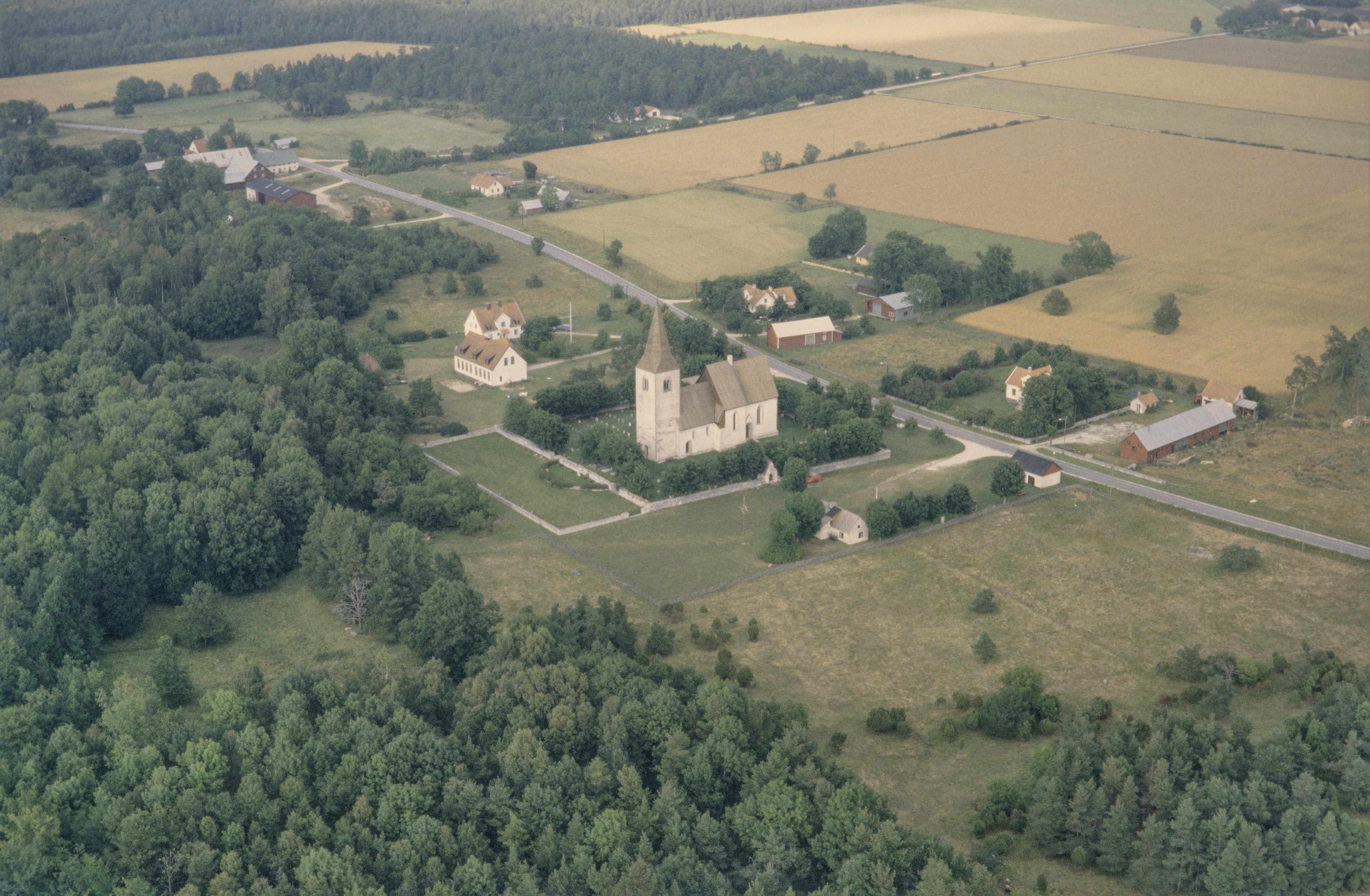 Beskrivning: Vallstena kyrkby. Vallstena kyrka vid bildens mitt. I bildens nedre del område med fossil åkermark och gravfält RAÄnr Vallstena 87:1. Bilden är tagen mot (väderstreck): NNO