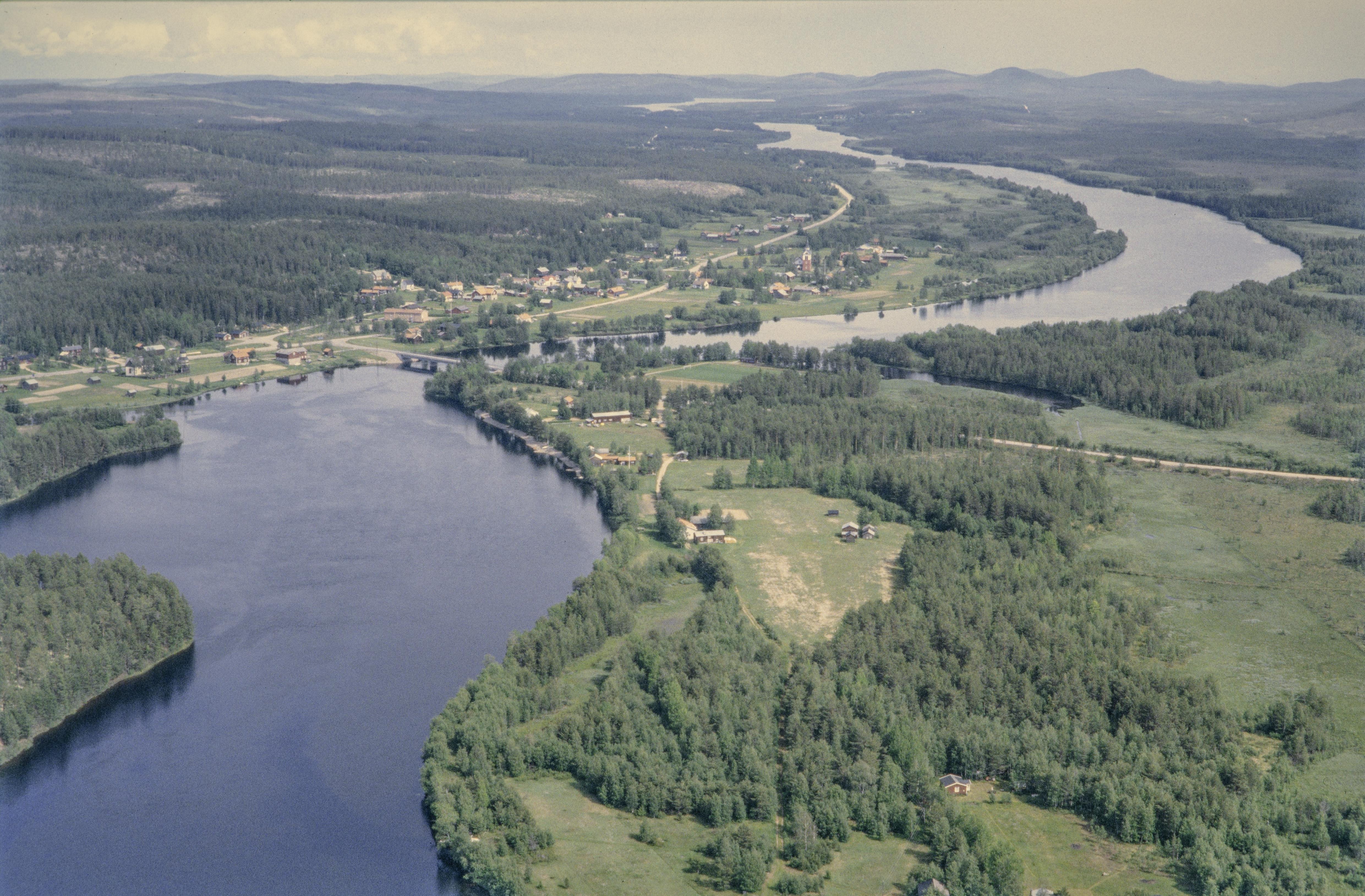 Beskrivning: Vid bildens mitt Norrälvens utlopp i älven Ljusnan vid Älvros kyrkby. Älvros gamla kyrka till vänster om bildens mitt, Älvros nya kyrka (Älvros kyrka) till höger över bildens mitt. I byn bytomt RAÄnr Älvros 464, 483, 465, 474, 484, 545 m.fl. Bilden är tagen mot (väderstreck): Ö