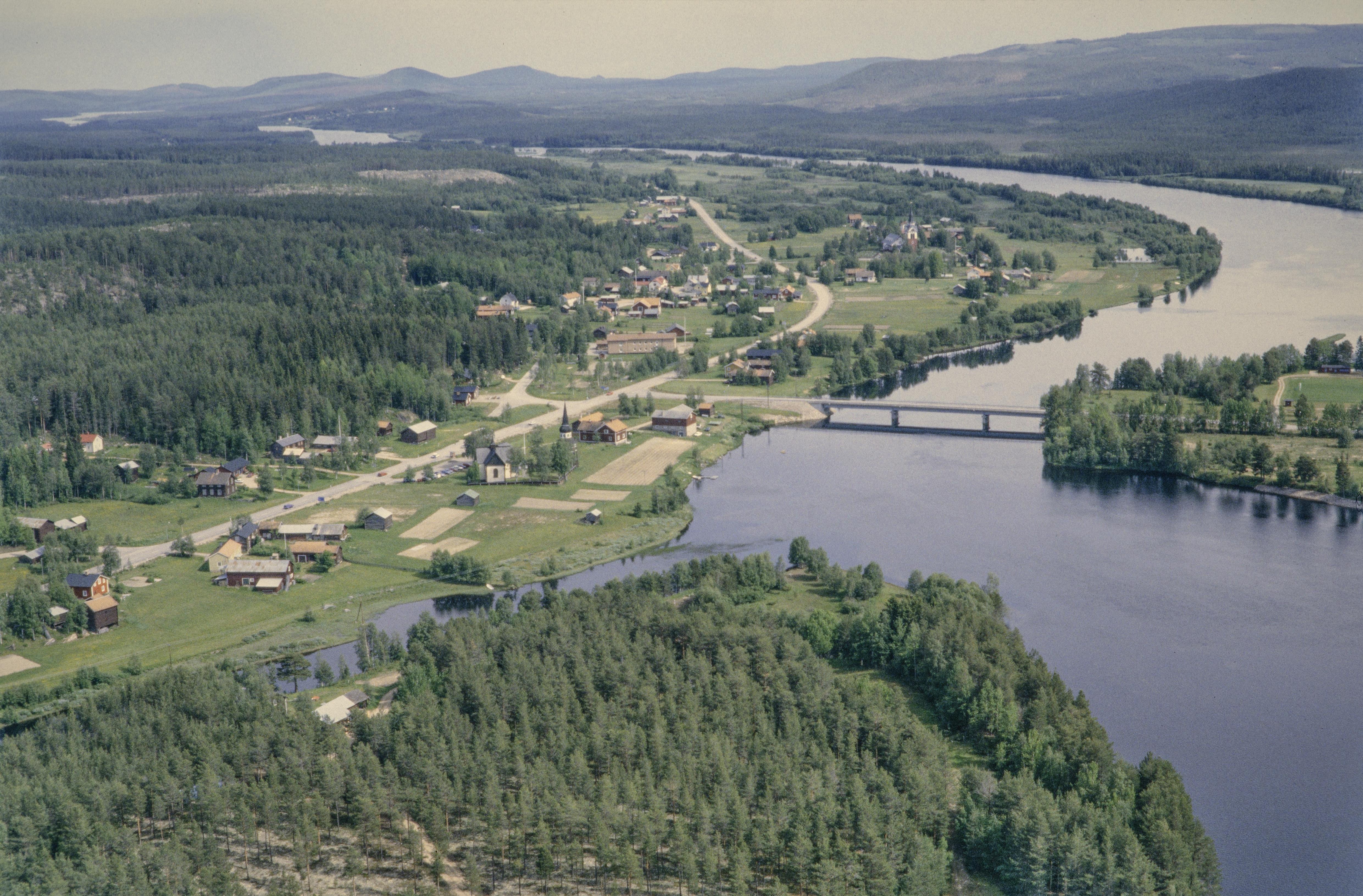 Beskrivning: Älven Ljusnan vid Älvros kyrkby. Norrälvens utlopp nere till vänster. Älvros gamla kyrka till vänster om bildens mitt, Älvros nya kyrka (Älvros kyrka) till höger över bildens mitt. I byn bytomt RAÄnr Älvros 464, 483, 465, 474, 484, 545 m.fl. Bilden är tagen mot (väderstreck): Ö