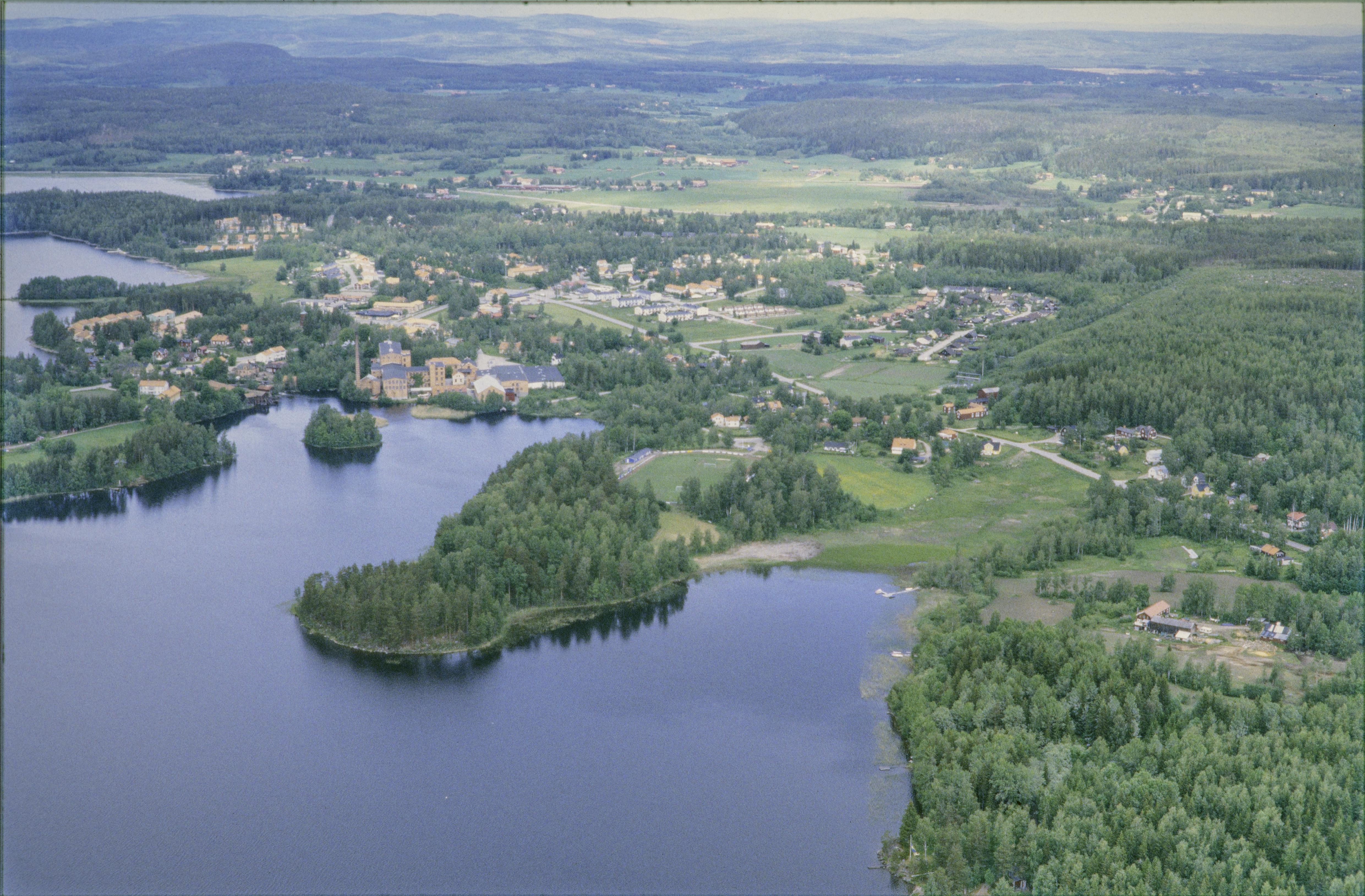 Beskrivning: Sörforsa tätort och industriort mellan Kykrsjön (uppe till vänster) och Långsjön. På udden i bildens mitt röjningsröse RAÄnr Forsa 176:1. Bilden är tagen mot (väderstreck): N