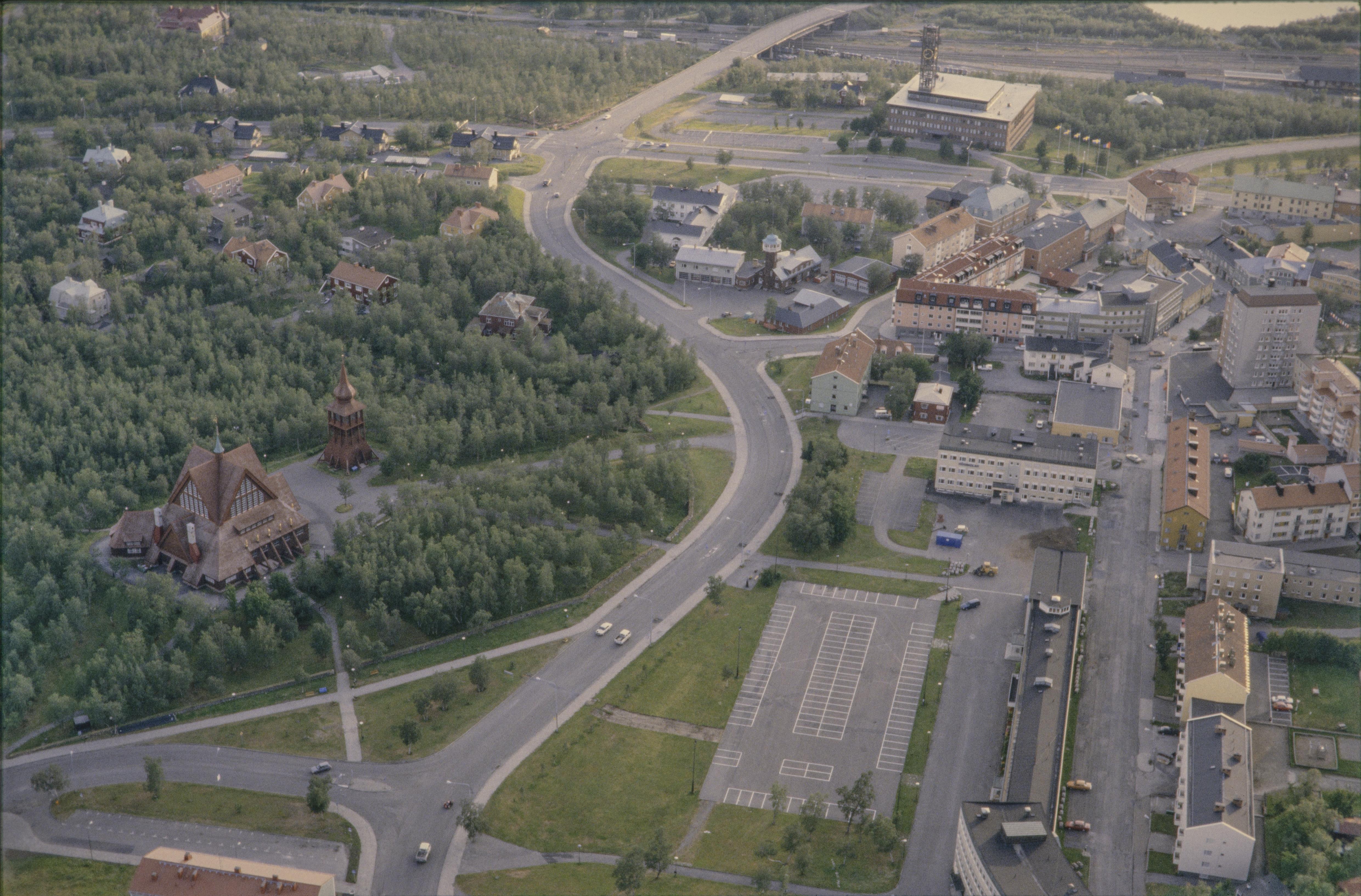 Beskrivning: Kiruna (Giron) tätort och gruvsamhälle. Till vänster under bildens mitt Kiruna kyrka och minnesmärke RAÄnr Jukkasjärvi 159:1. I bildens övre del Kiruna stadshus vid sjön Luossajärvi. (Området var tidigare i f.d. socknet Kiruna stad, men är nu i Jukkasjärvi socken). Bilden är tagen mot (väderstreck): VSV