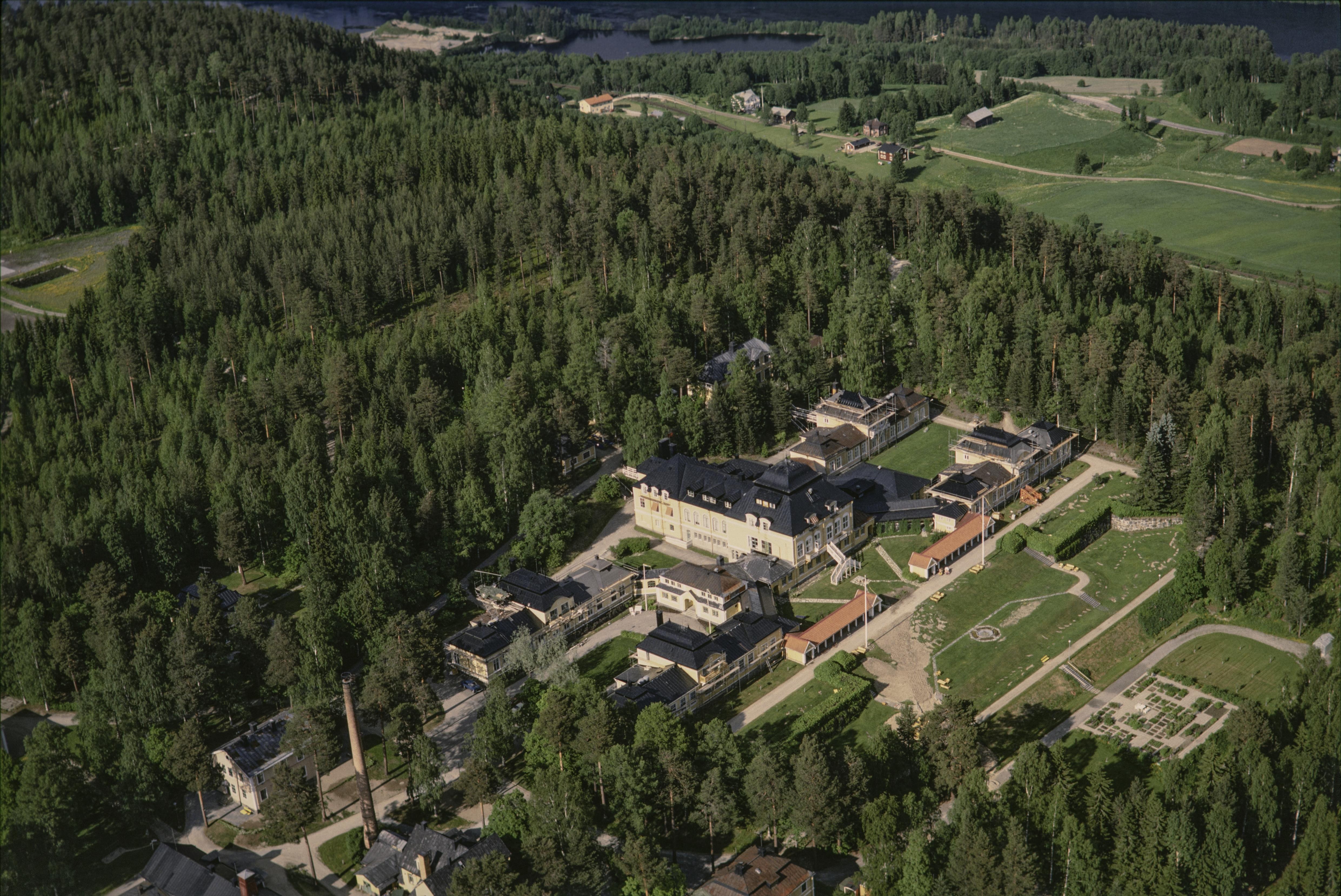 Beskrivning: Byggnadsminnet Österåsens sanatorium och minnesstenen RAÄnr Ed 81:1 norr i orten Österås där Ångermanälven och Faxälven möts. Bilden är tagen mot (väderstreck): NO