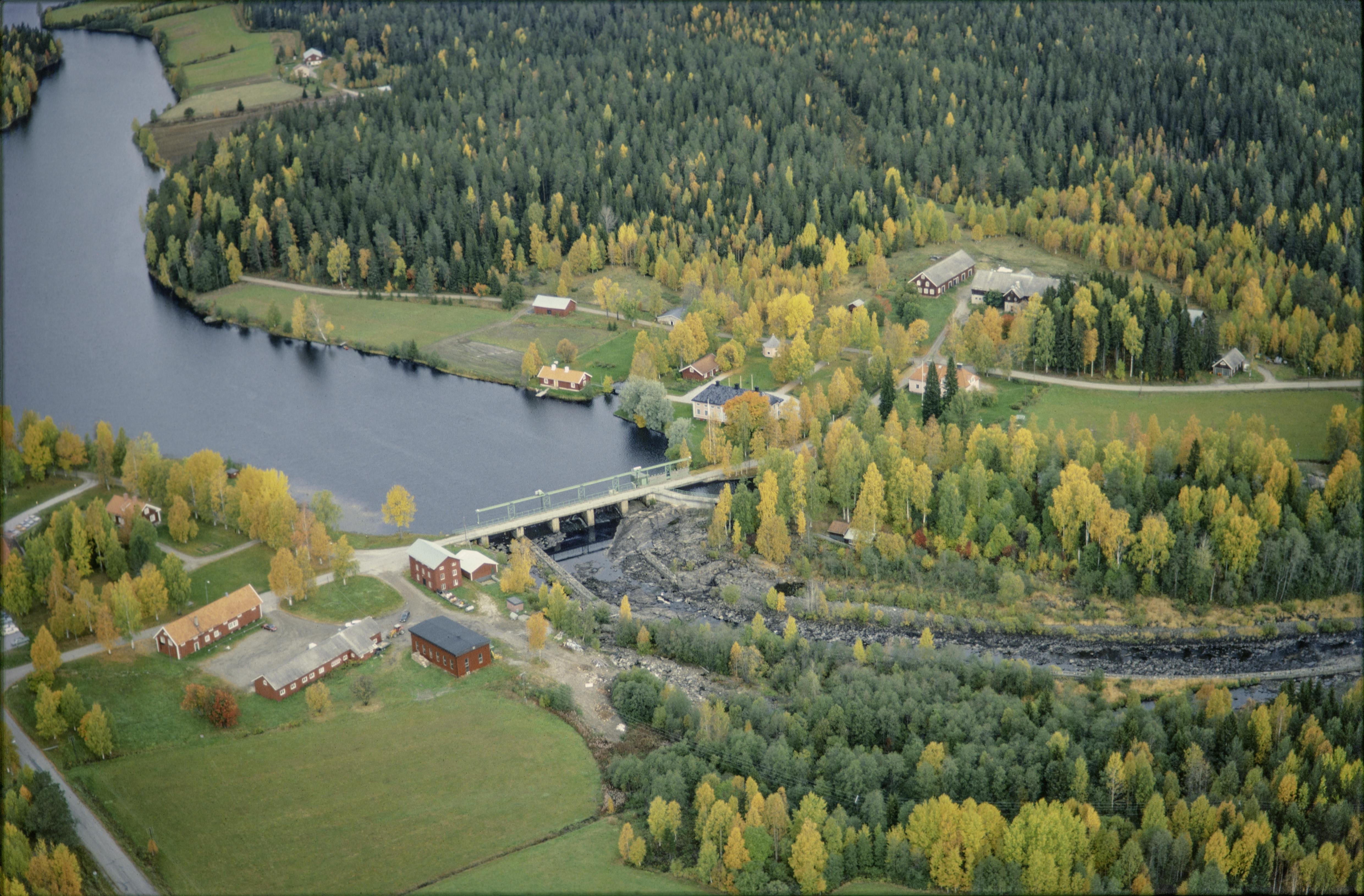 Beskrivning: Gideåbruk (skrivs även Gideå bruk) i Gideälven. Vid bildens mitt område med järnbrukslämningar RAÄnr Gideå 5:1. Vid vägen över bildens mitt vägmärke RAÄnr Gideå 3:1. Bilden är tagen mot (väderstreck): NNV