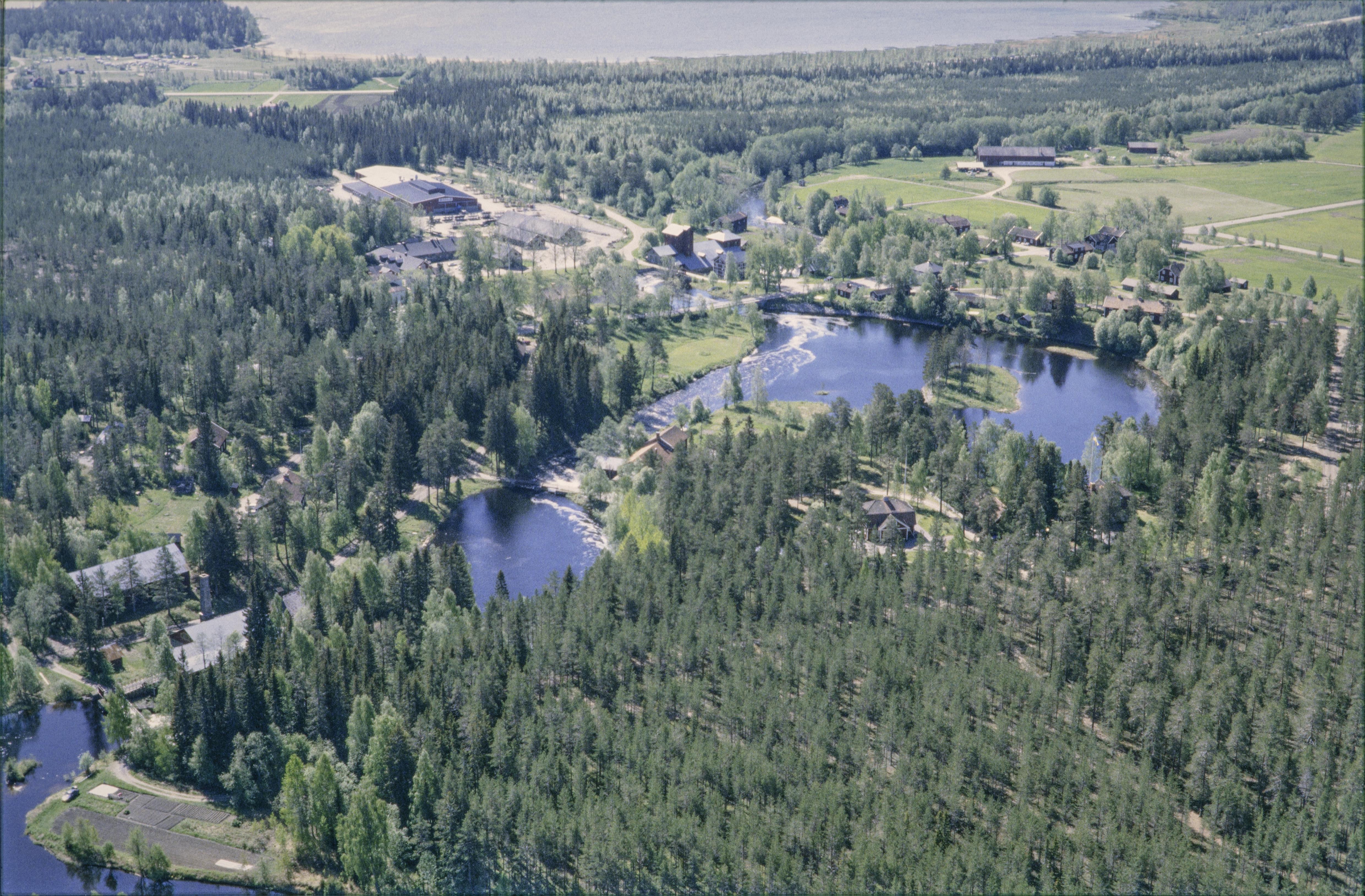 Beskrivning: Olofsfors järnbruk (Olofsfors bruk) vid Leduån. Lustholmen i vattnet till höger om bildens mitt. Olofsfors gamla flygfält vid Nordmalingsfjärden uppe till höger. Bilden är tagen mot (väderstreck): S