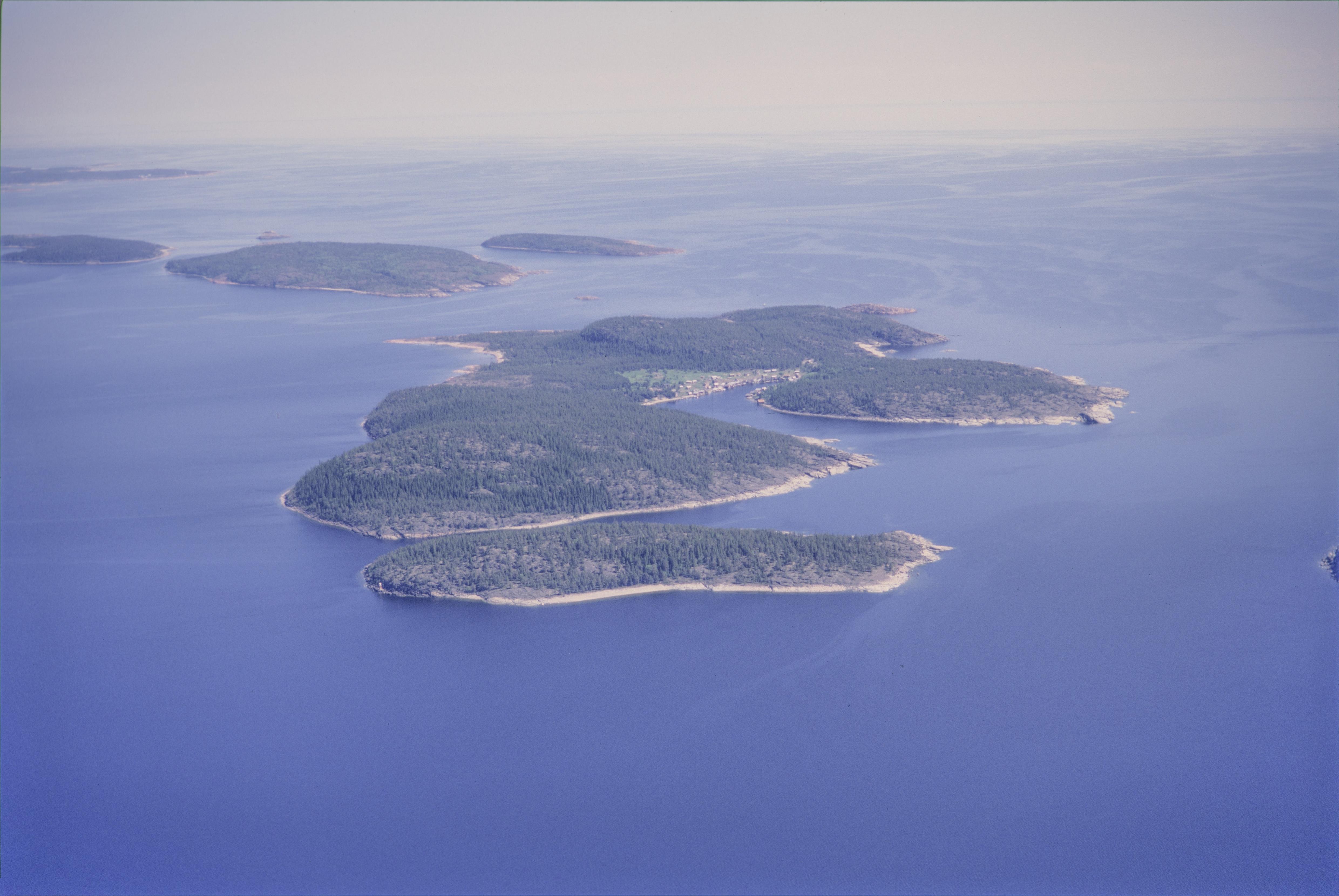 Beskrivning: Höga kustens världsarvsområde. Öar i naturreservatet Trysunda öster om Nätrafjärden. Trysundaholmen (under bildens mitt) vid huvudön Trysunda (i bildens mitt). Uppe till vänster fartygslämning RAÄnr Nätra 373 vid öarna Klösan och Ällön. I bildens mitt Trysunda fiskeläge med kapell på ön Trysunda. Bilden är tagen mot (väderstreck): Ö