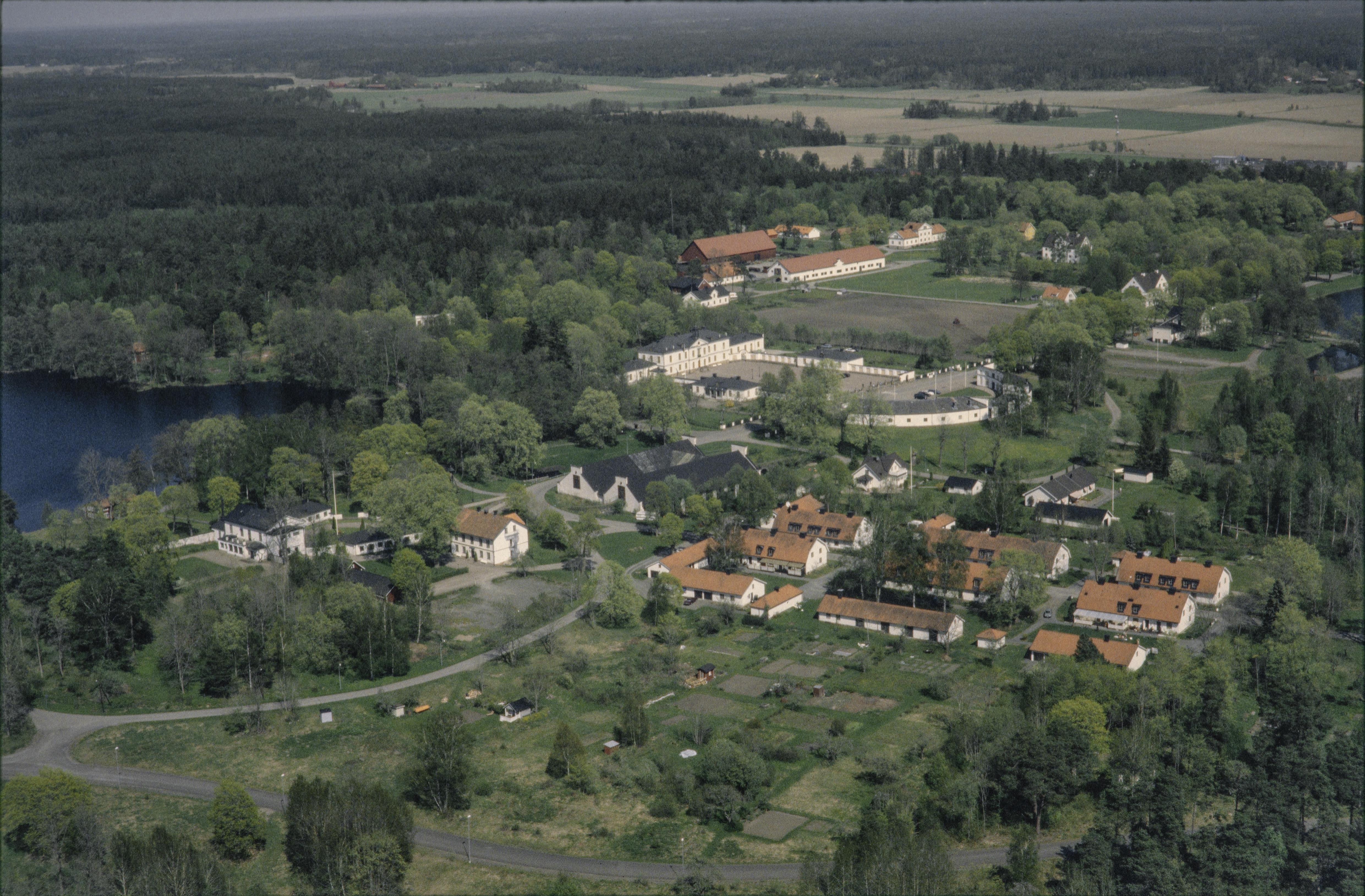 Beskrivning: Gimo bruk RAÄnr Skäfthammar 76:1-3 vid Gimo damm och Olandsåns dalgång. Till höger om bildens mitt Gimo herrgård. I bildens övre kant Olandsån som markerar gränsen mot socknet Hökhuvud. Bilden är tagen mot (väderstreck): NO