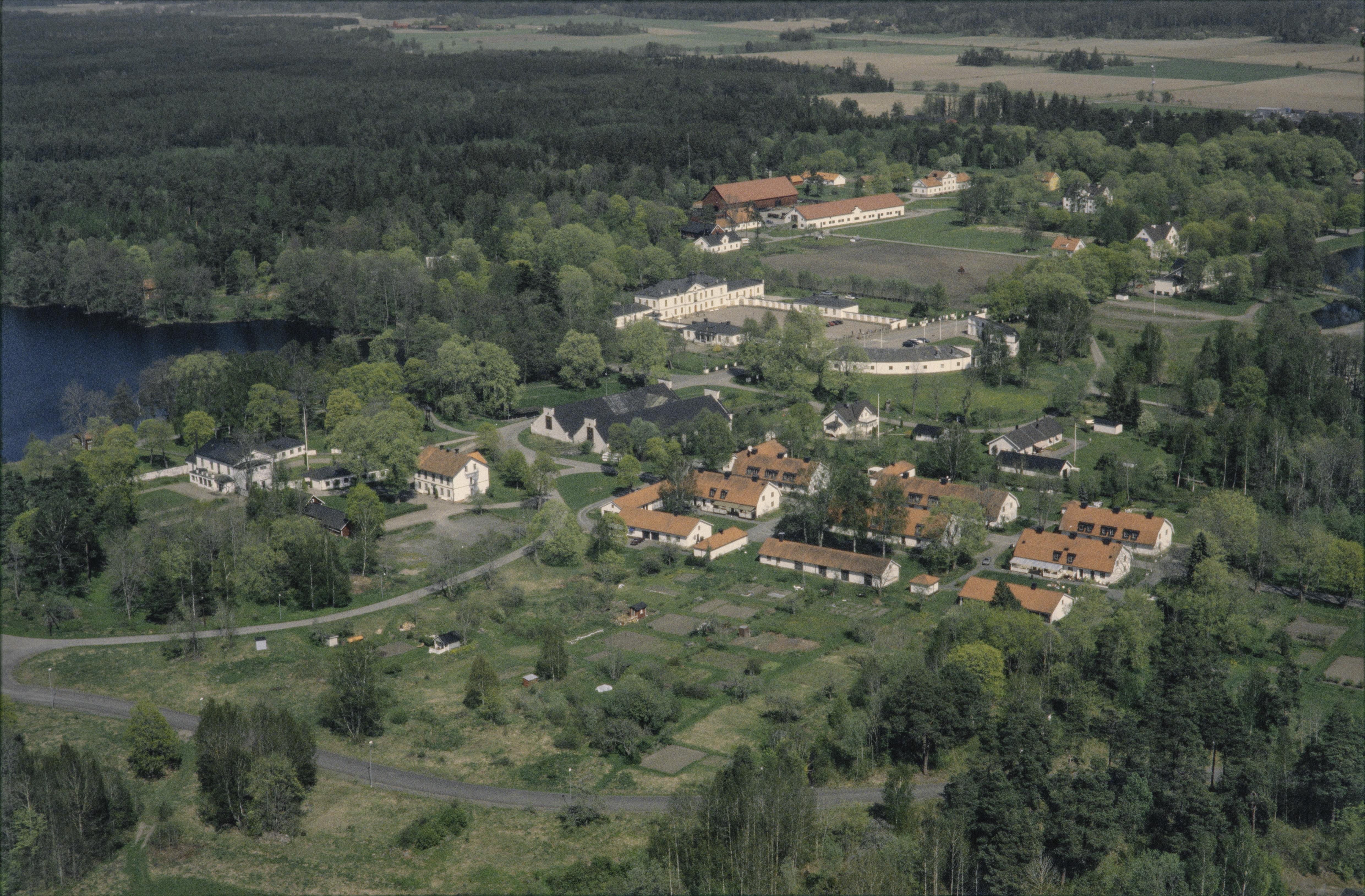 Beskrivning: Gimo bruk RAÄnr Skäfthammar 76:1-3 vid Gimo damm och Olandsåns dalgång. Till höger om bildens mitt Gimo herrgård. I bildens övre kant Olandsån som markerar gränsen mot socknet Hökhuvud. Bilden är tagen mot (väderstreck): NO