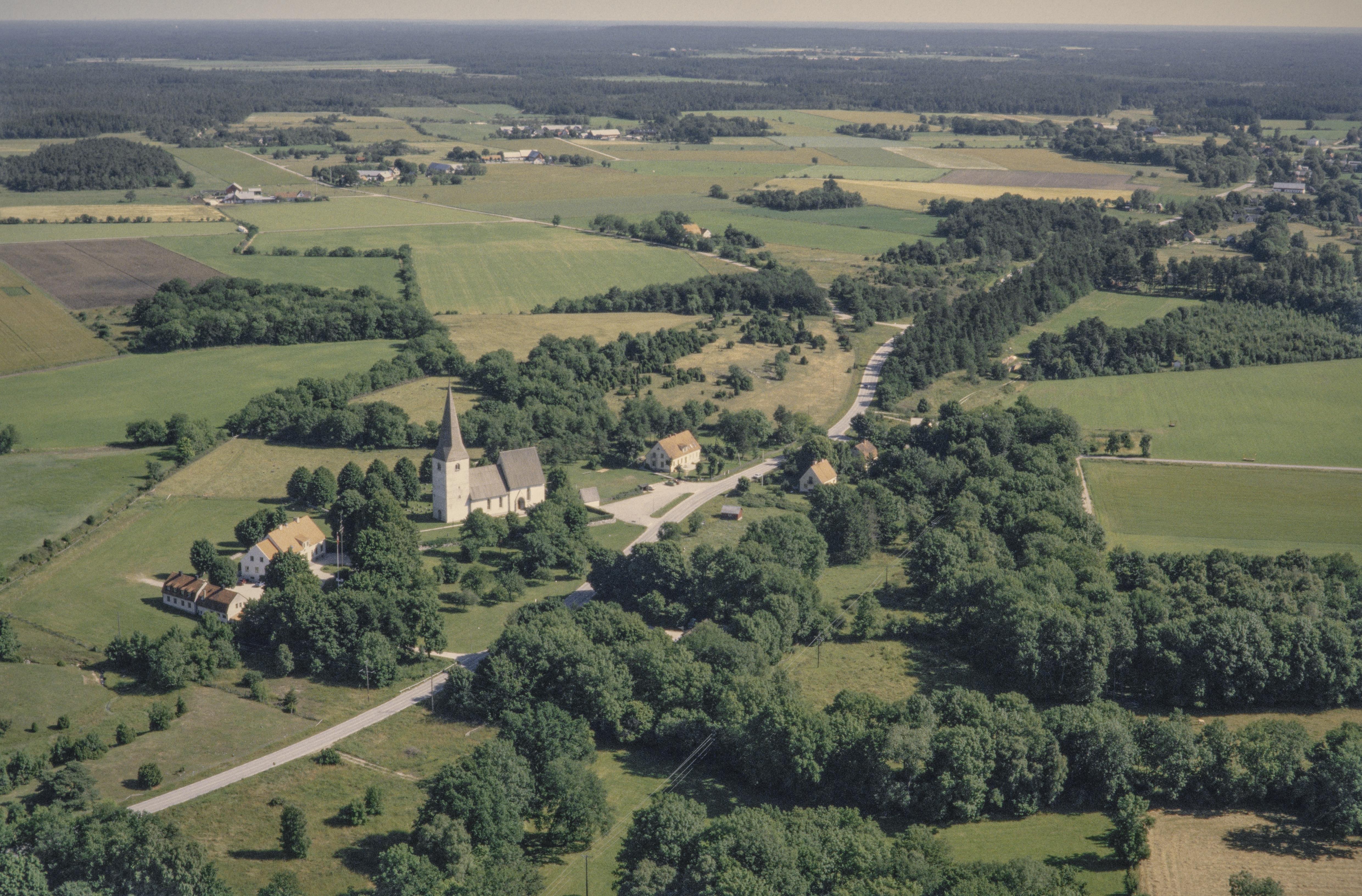Beskrivning: Alskogs kyrka och kyrkby. Vid kyrkan två grindstolpar RAÄnr Alskog 222:1. (Bilden tillhör även Riksintresse-nr I32 - Alskog.) Bilden är tagen mot (väderstreck): NNO