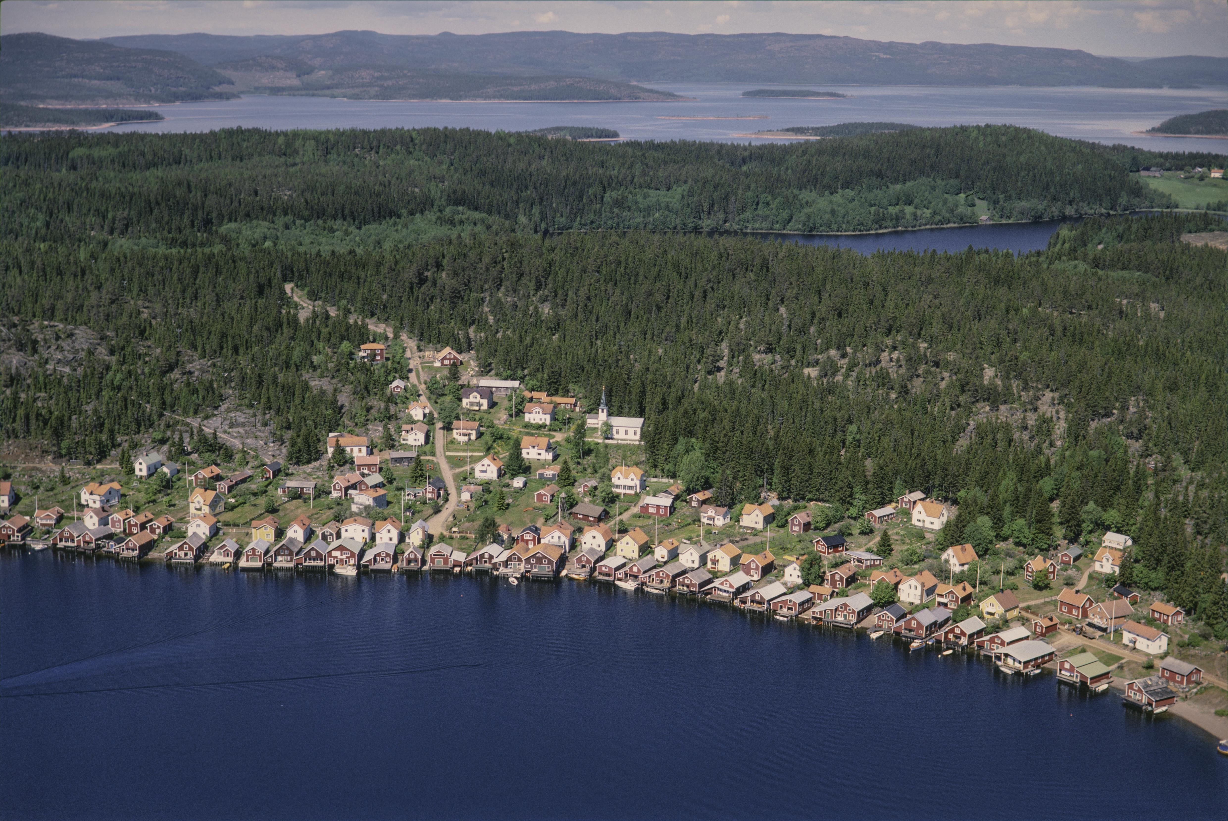 Beskrivning: Världsarvsområdet Höga kusten. Ulvöhamn fiskeläge och kyrkby på ön Norra Ulvön. Ulvö kyrka över bildens mitt. Vid vägen i fiskeläget minnesmärket RAÄnr Nätra 111:1. Bilden är tagen mot (väderstreck): NV