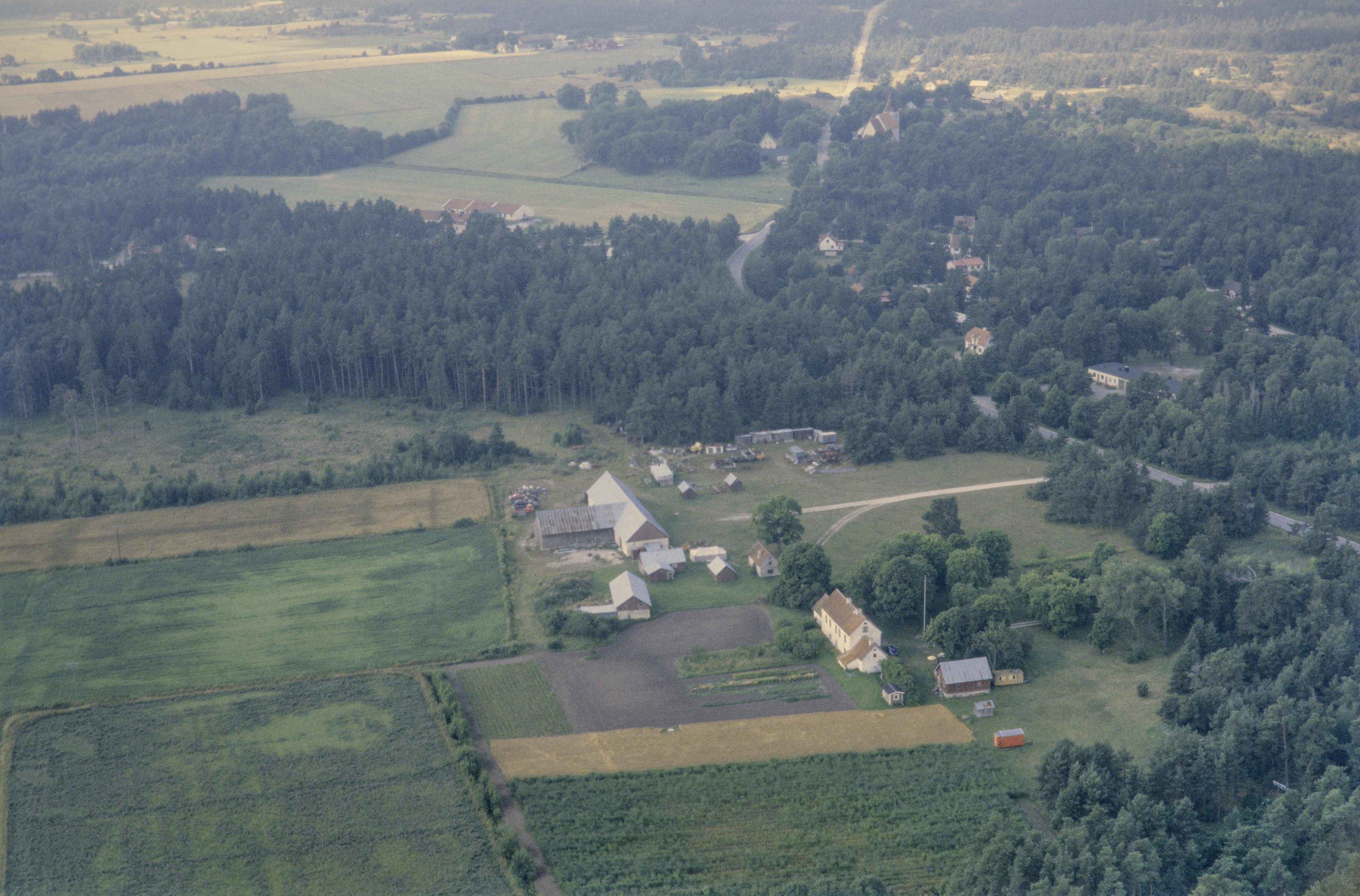 Beskrivning: I bildens nedre del gården Duss. Området Duss RAÄnr Bro 137:1 har tidigare utpekats som plats för myntprägling / mynthus. Bro kyrka i bildens övre del. Bilden är tagen mot (väderstreck): SV