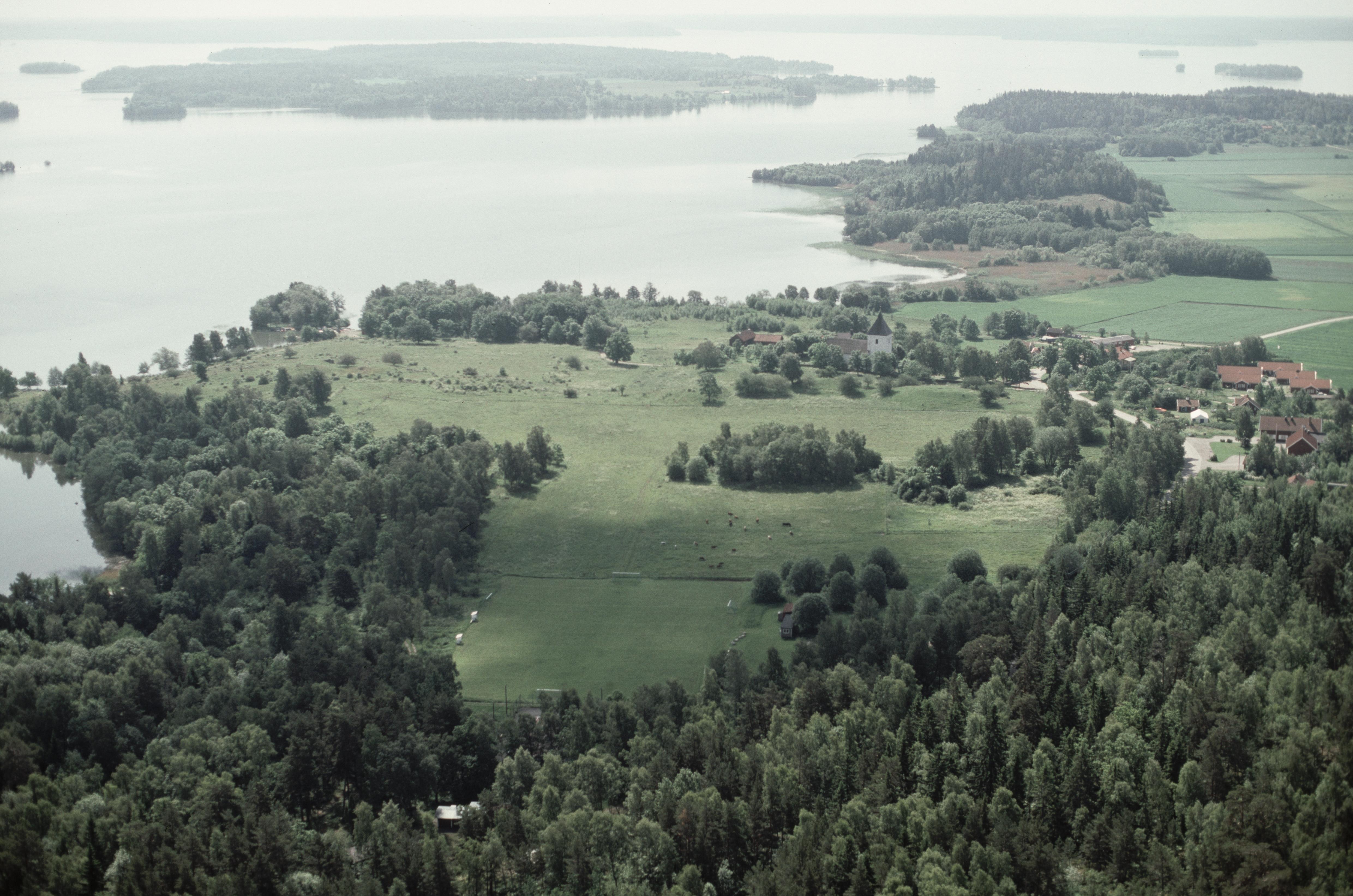 Beskrivning: Fornlämningsområdet Hovgården RAÄnr Adelsö 46:2 på Adelsön vid Hovgårdsfjärden i Mälaren. Alsnö hus RAÄnr Adelsö 47:1, Adelsö kyrka, Kungshögarna Adelsö 48:1-6 m.fl. I bildens övre del ön Björkö-Birka. Bilden är tagen mot (väderstreck): S