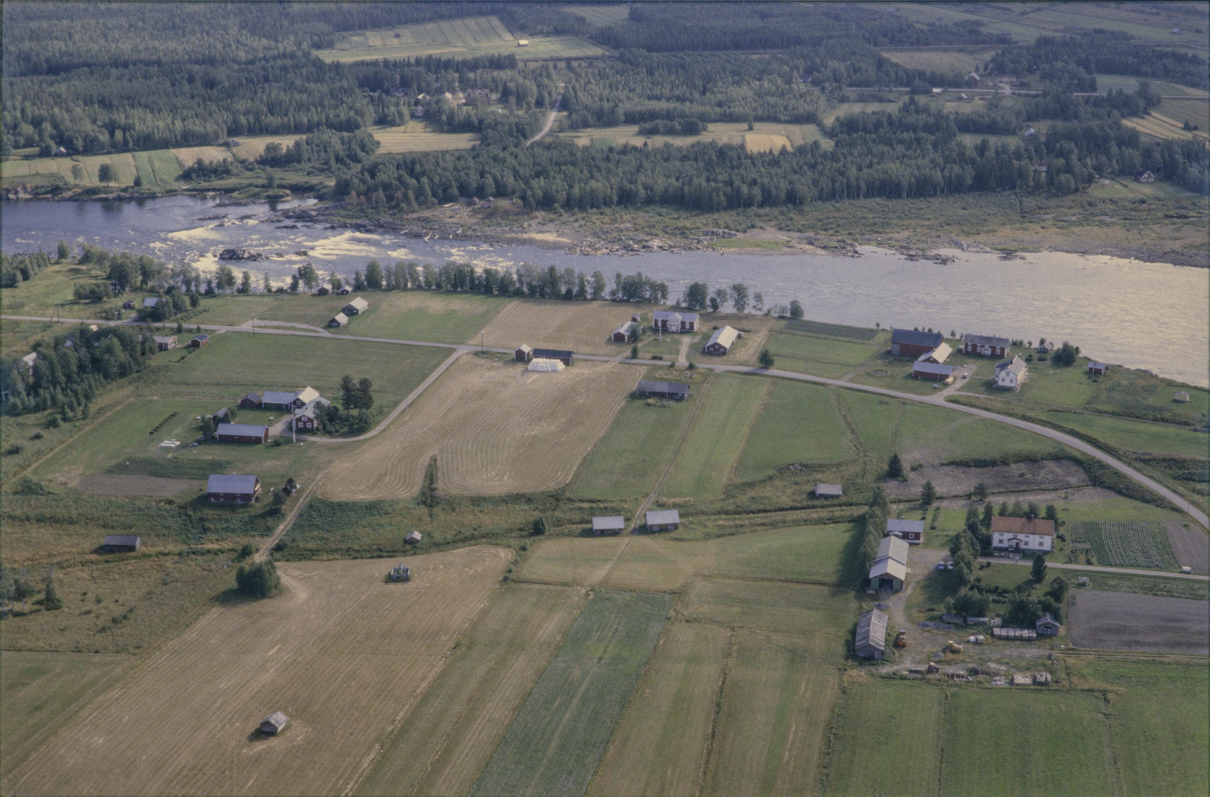 Beskrivning: Torneälven i Tornedalen. Uppe till vänster forsområdet Matkakoski norr i Korpikylä by. Vid älvkanten bytomt RAÄnr Karl Gustav 156:1, minnesmärke Karl Gustav 281:1, m.m. Torneälven markerar riksgränsen mot Finland (i bildens övre del). Bilden är tagen mot (väderstreck): ONO