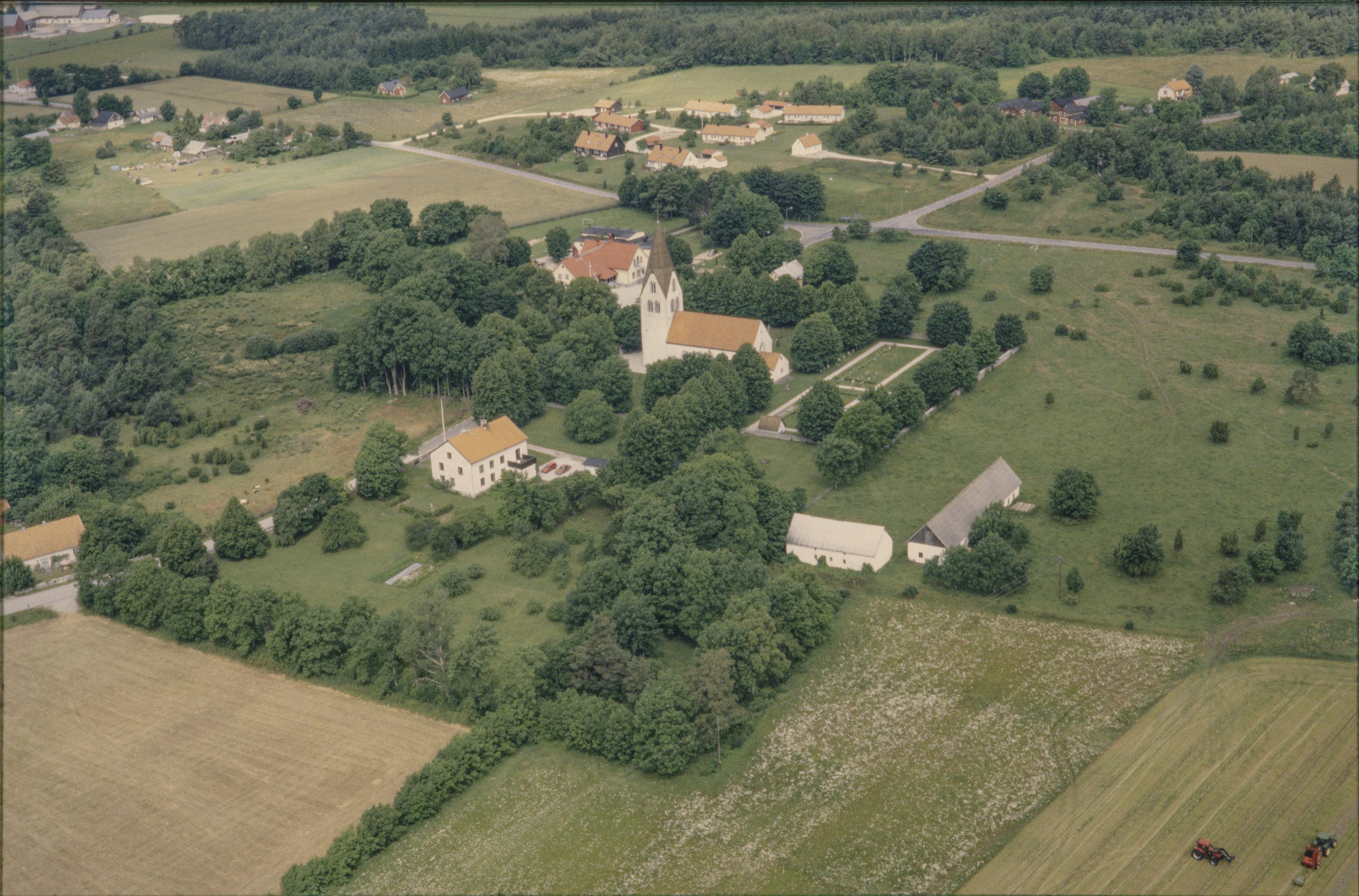 Beskrivning: Eksta kyrka och kyrkby. Vid kyrkan fyndplats (bronsfat, ringsölja av brons m.m.) RAÄnr Eksta 231:1. Bilden är tagen mot (väderstreck): NV