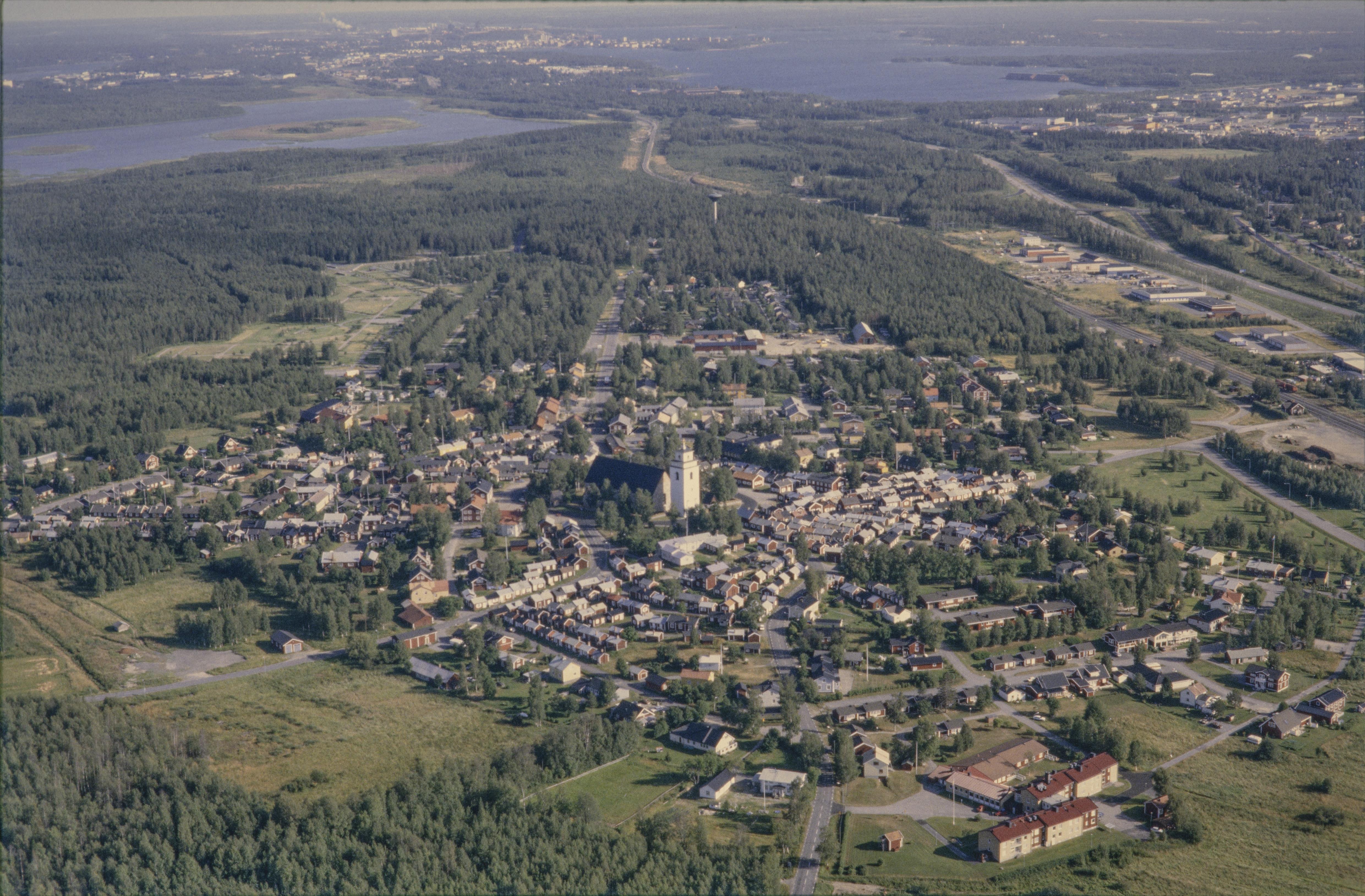 Beskrivning: Gammelstads kyrkstad och världsarv. Nederluleå kyrka vid bildens mitt. Vid kyrkan ett minnesmärke RAÄnr Nederluleå 67:1, bytomt Nederluleå 175:1, m.m. Gammelstadsviken, Luleälven och Luleå stad i bildens övre del. Bilden är tagen mot (väderstreck): SSO