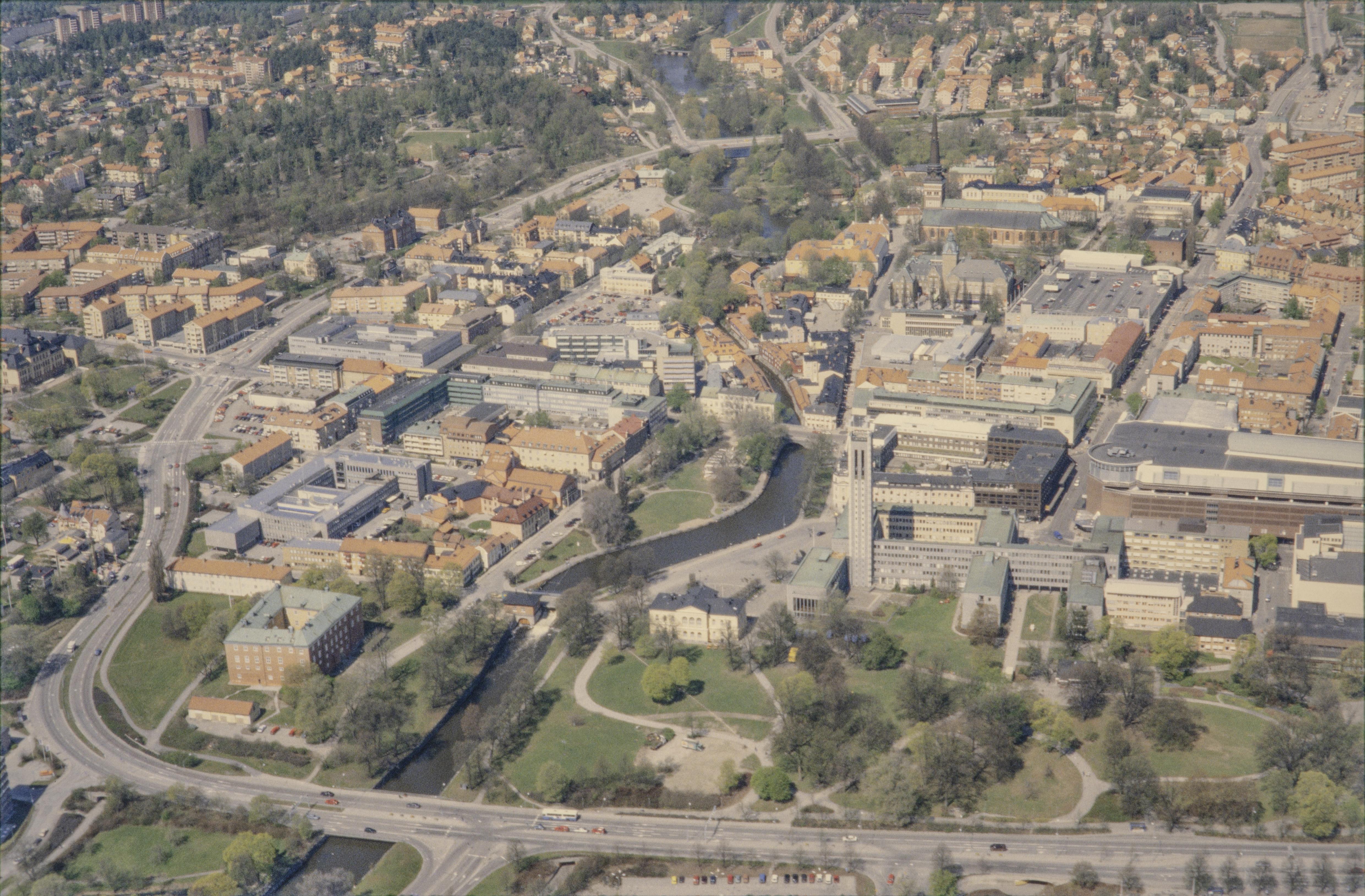 Beskrivning: Västerås stad vid Svartån och Västeråsfjärden i Mälaren. Stadslager RAÄnr Västerås 232:1. Nere till vänster statliga byggnadsminnet RAÄnr Västerås 224:1 Västerås slott. Till höger om bildens mitt Västerås rådhus. Till höger över bildens mitt Västerås domkyrka. Bilden är tagen mot (väderstreck): NNV