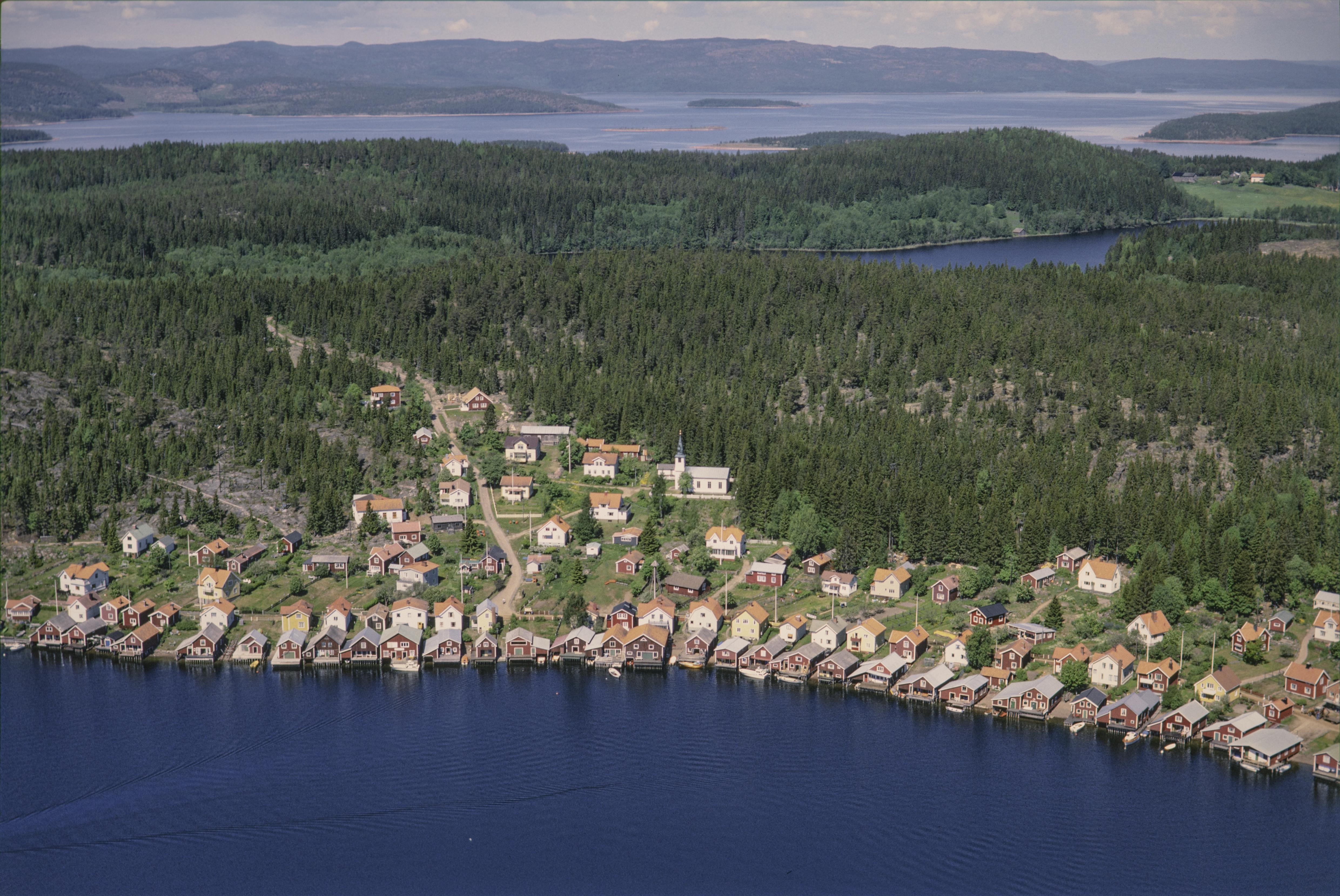 Beskrivning: Världsarvsområdet Höga kusten. Ulvöhamn fiskeläge och kyrkby på ön Norra Ulvön. Ulvö kyrka över bildens mitt. Vid vägen i fiskeläget minnesmärket RAÄnr Nätra 111:1. Bilden är tagen mot (väderstreck): NV