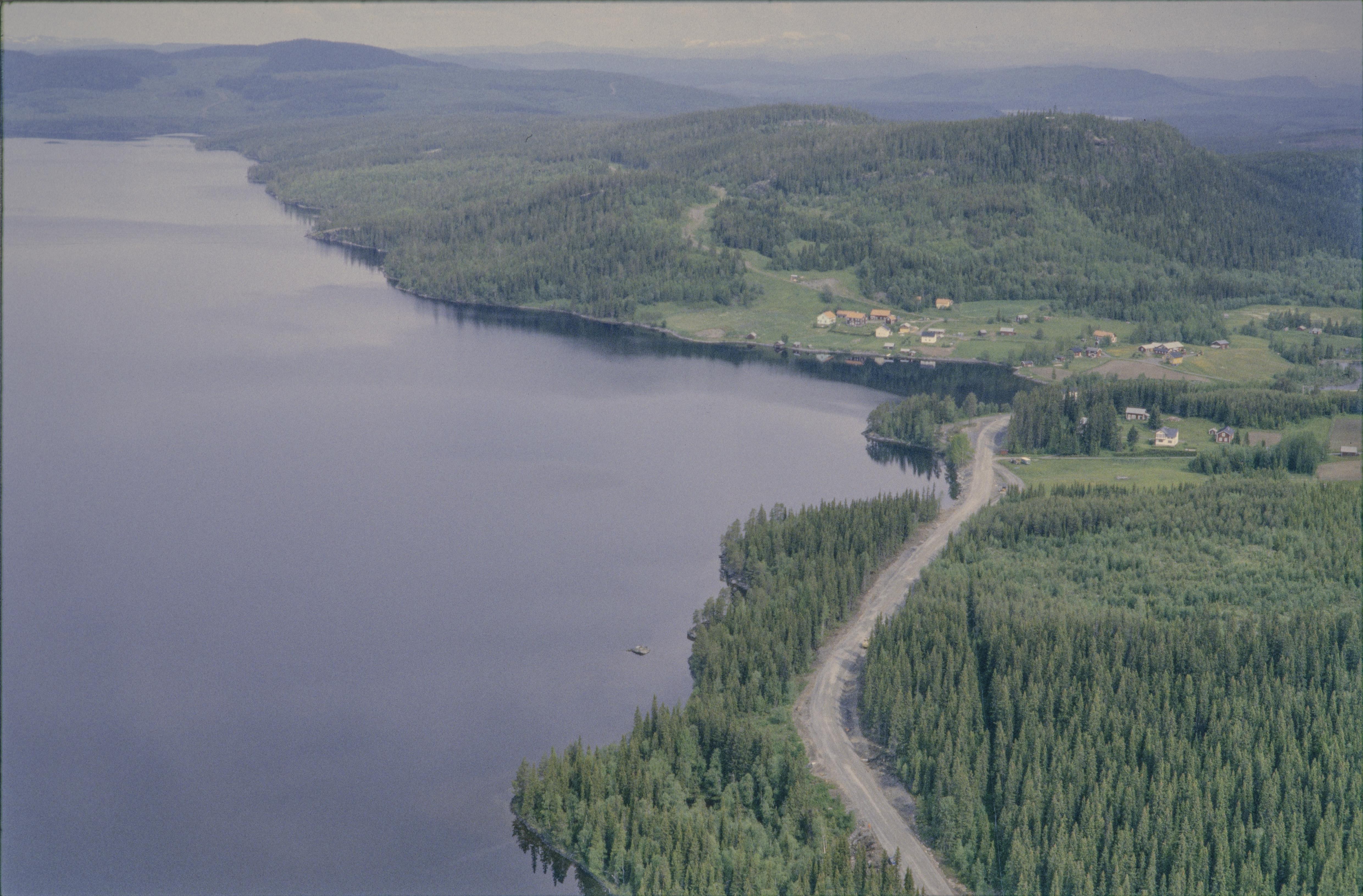 Beskrivning: Skärvångssjön vid Norra Skärvångens by. Vid bildens mitt boplats RAÄnr Föllinge 180:1 m.fl. Uppe till höger Nordsjöberget och till vänster områden med hällmålningar vid sjöns strand. Bilden är tagen mot (väderstreck): N