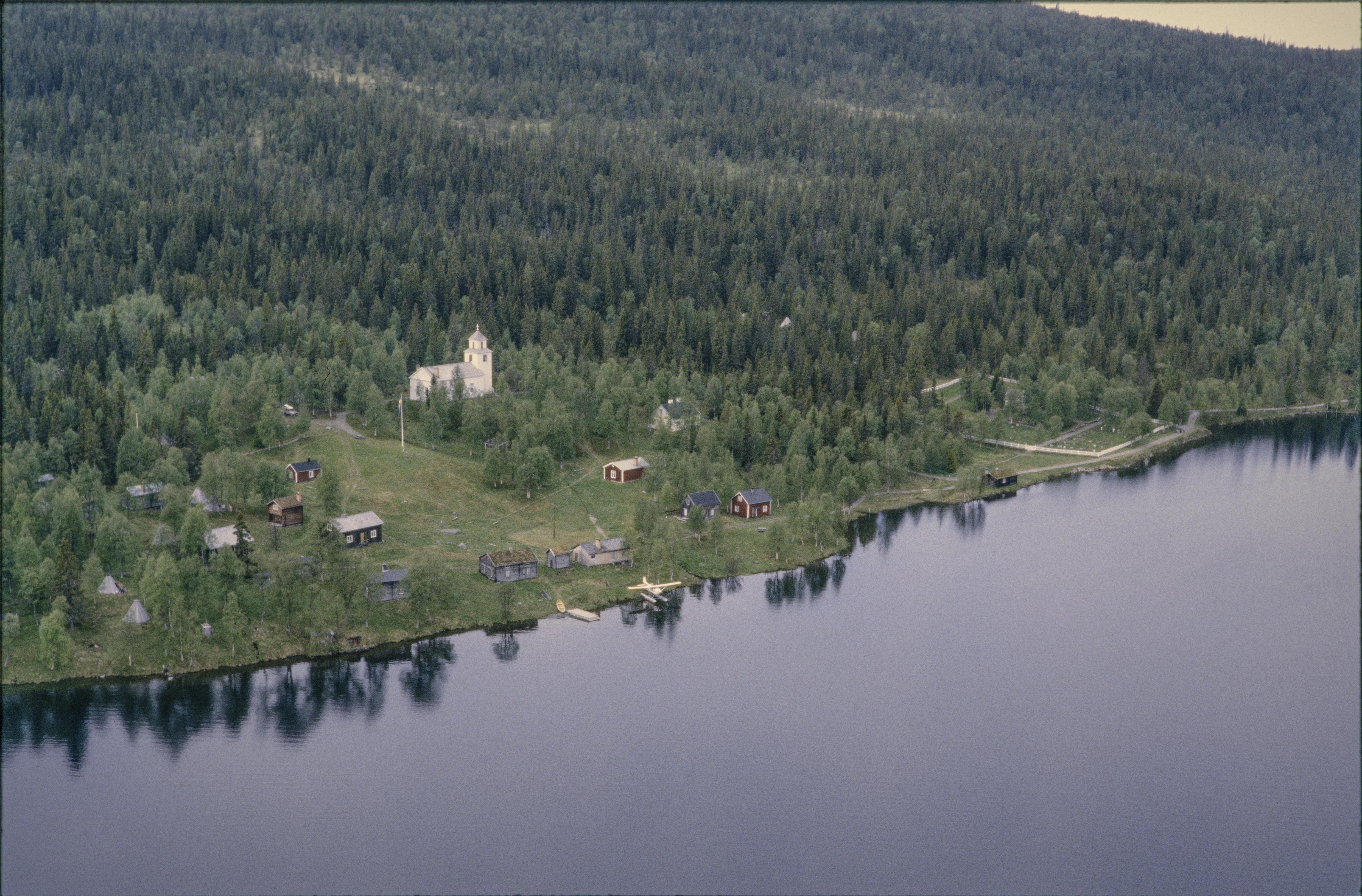 Beskrivning: Fatmomakke (Faepmie) kulturreservat och kyrkstad vid Fatmomakkeviken i norra ändan av Kultsjön (Gåaltoe). Fatmomakke kapell till vänster om bildens mitt. Vid kyrkstaden boplats RAÄnr Vilhelmina 46:1 m.m. Bilden är tagen mot (väderstreck): SV