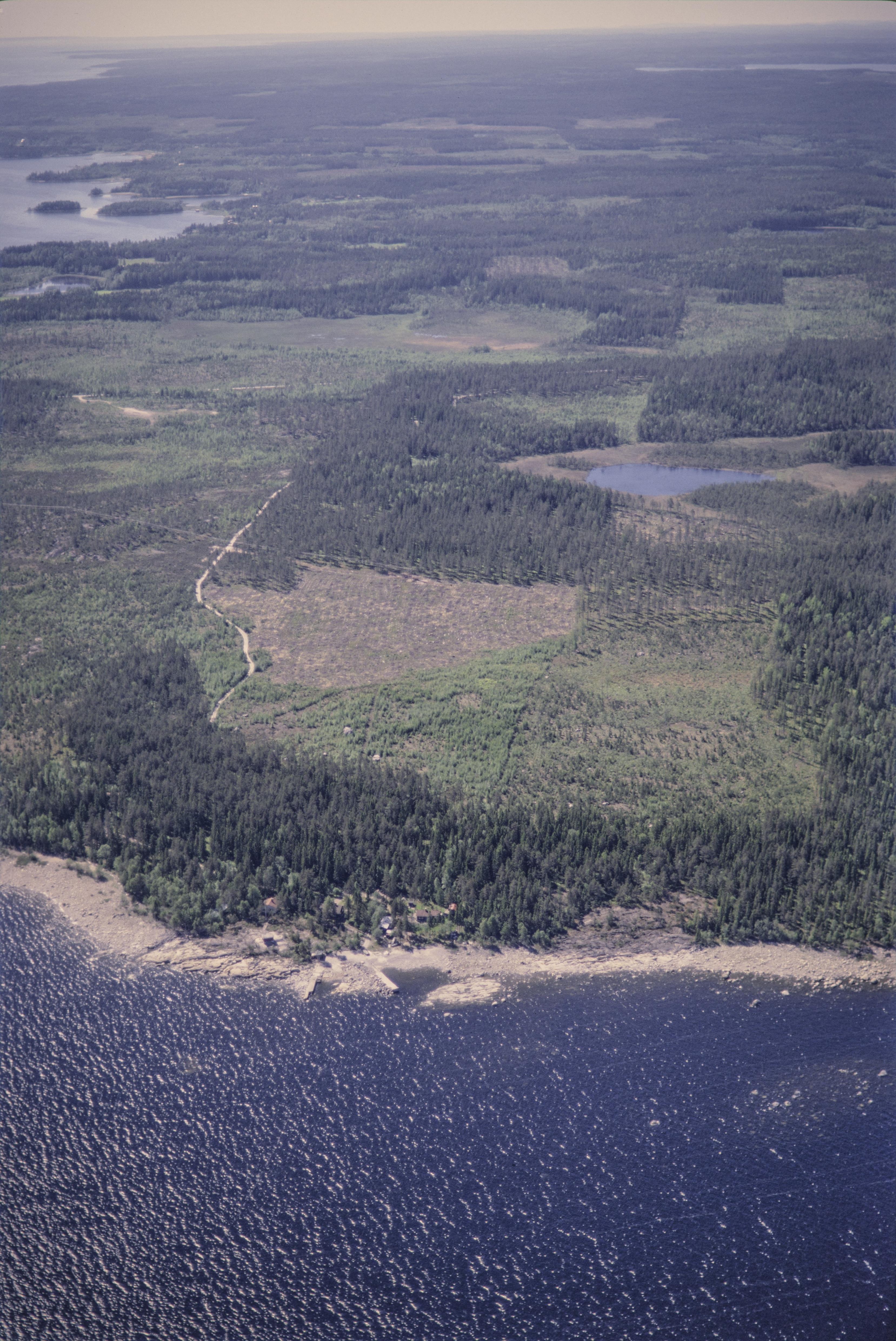Beskrivning: Björkön, Njurundakusten. I bildens nedre del området mellan Bergaudd och Hälludden, öster om Bergafjärden. Under bildens mitt skogbrukslämningar RAÄnr Njurunda 1142 och 1150 vid Ässjötjärnen. Bilden är tagen mot (väderstreck): SSV