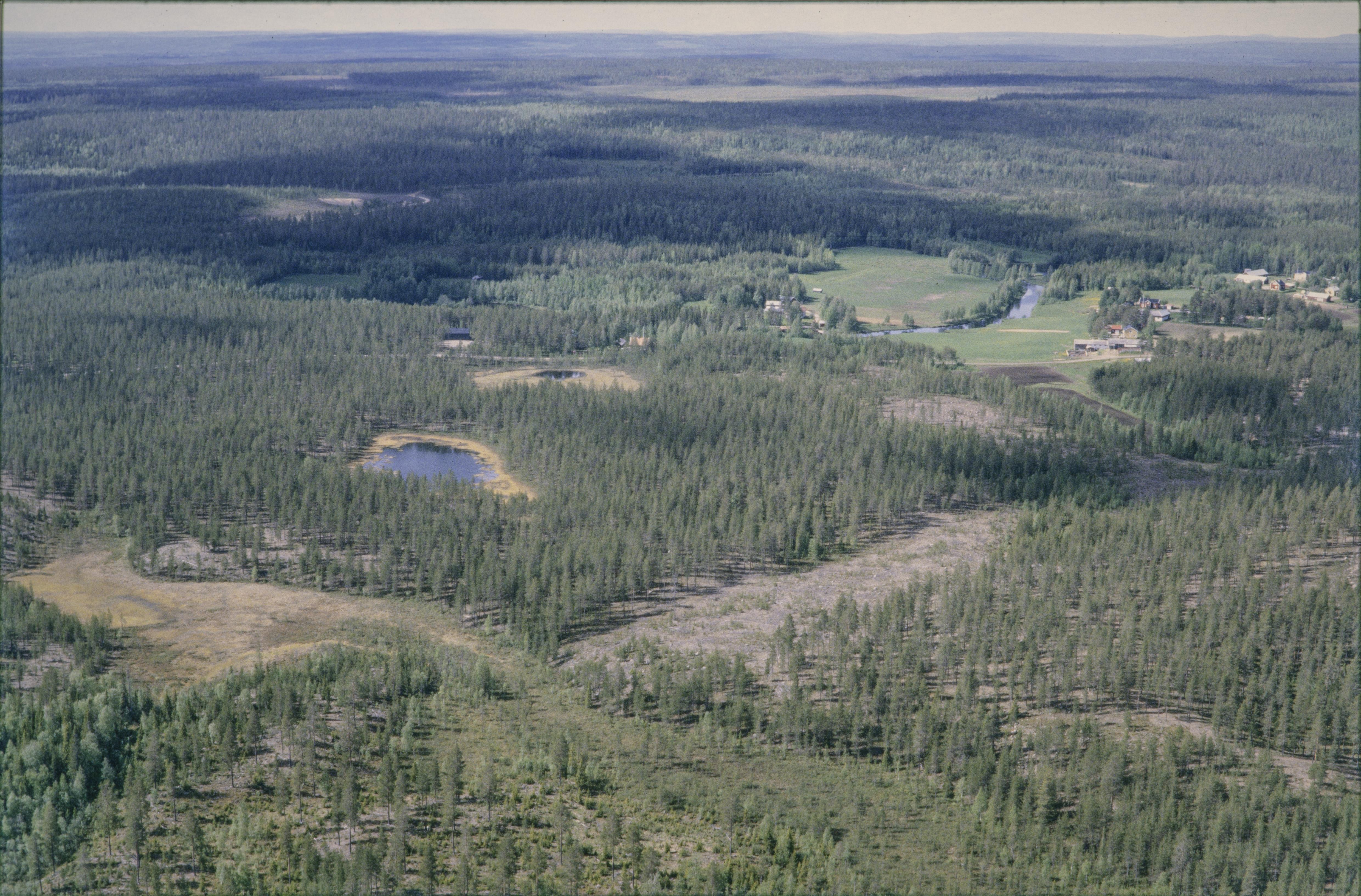 Beskrivning: Fattenborgs naturreservat och fornlämningsområde vid Töreälven. Vid bildens mitt Bortre Lilltjärnen och Lilltjärnen. Vid tjärnen boplatsgrop RAÄnr Töre 341:1, 405:1, gravfält 320:1, härd 415:1. m.m. Uppe till höger byn Långsel. Bilden är tagen mot (väderstreck): SV