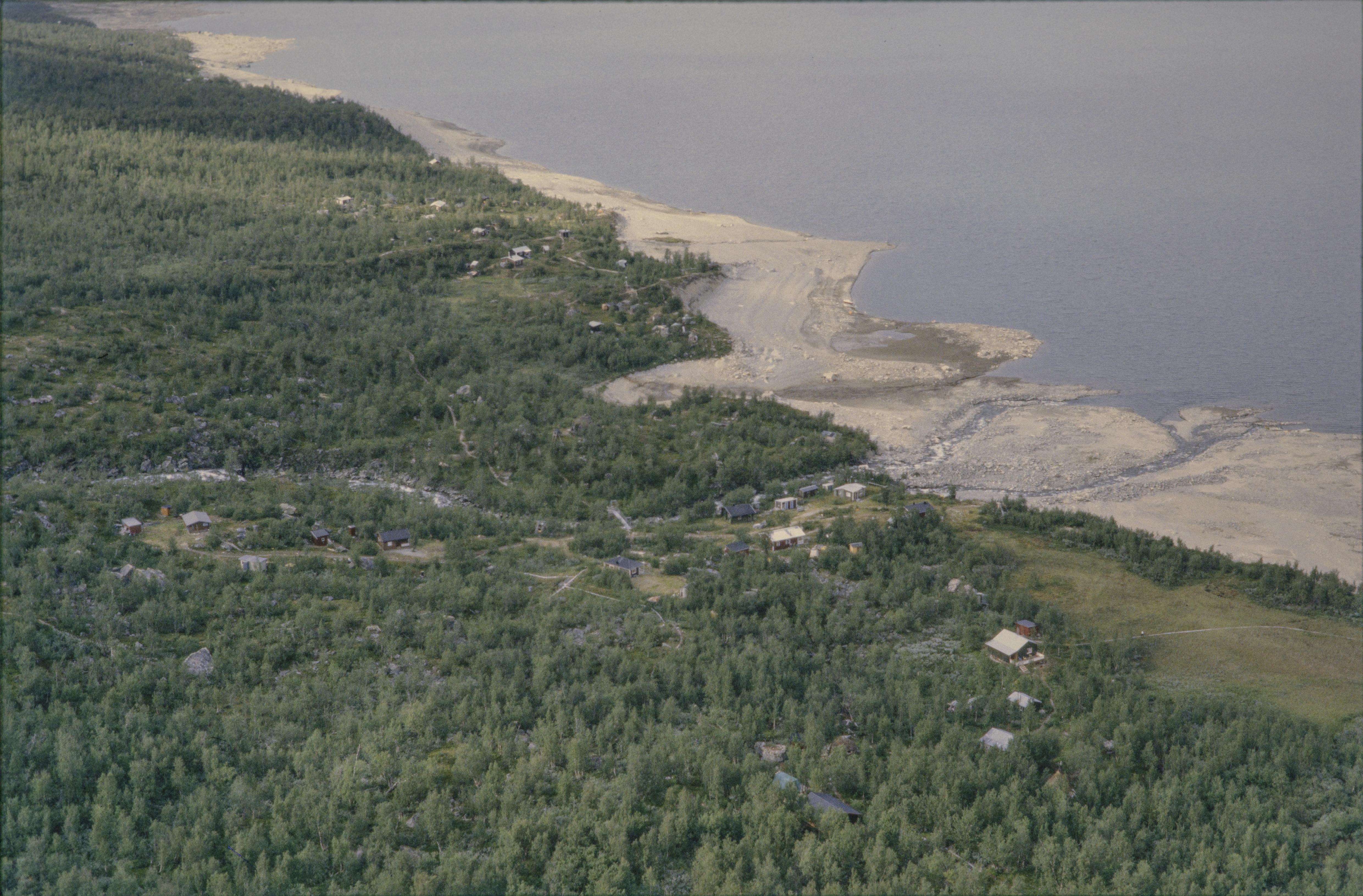 Beskrivning: Vaisaluokta (Vájsáluokta) sommarviste (för Karesuandosamer) vid sjöarna Akkajaure (Áhkájavrre) och Ritsenjaure (Rijtsemjávrre). Torvkåteläger med Vaisaluokta Kåtakyrka. Nere till vänster härd RAÄnr Jokkmokk 3434:1-2. Bilden är tagen mot (väderstreck): NO
