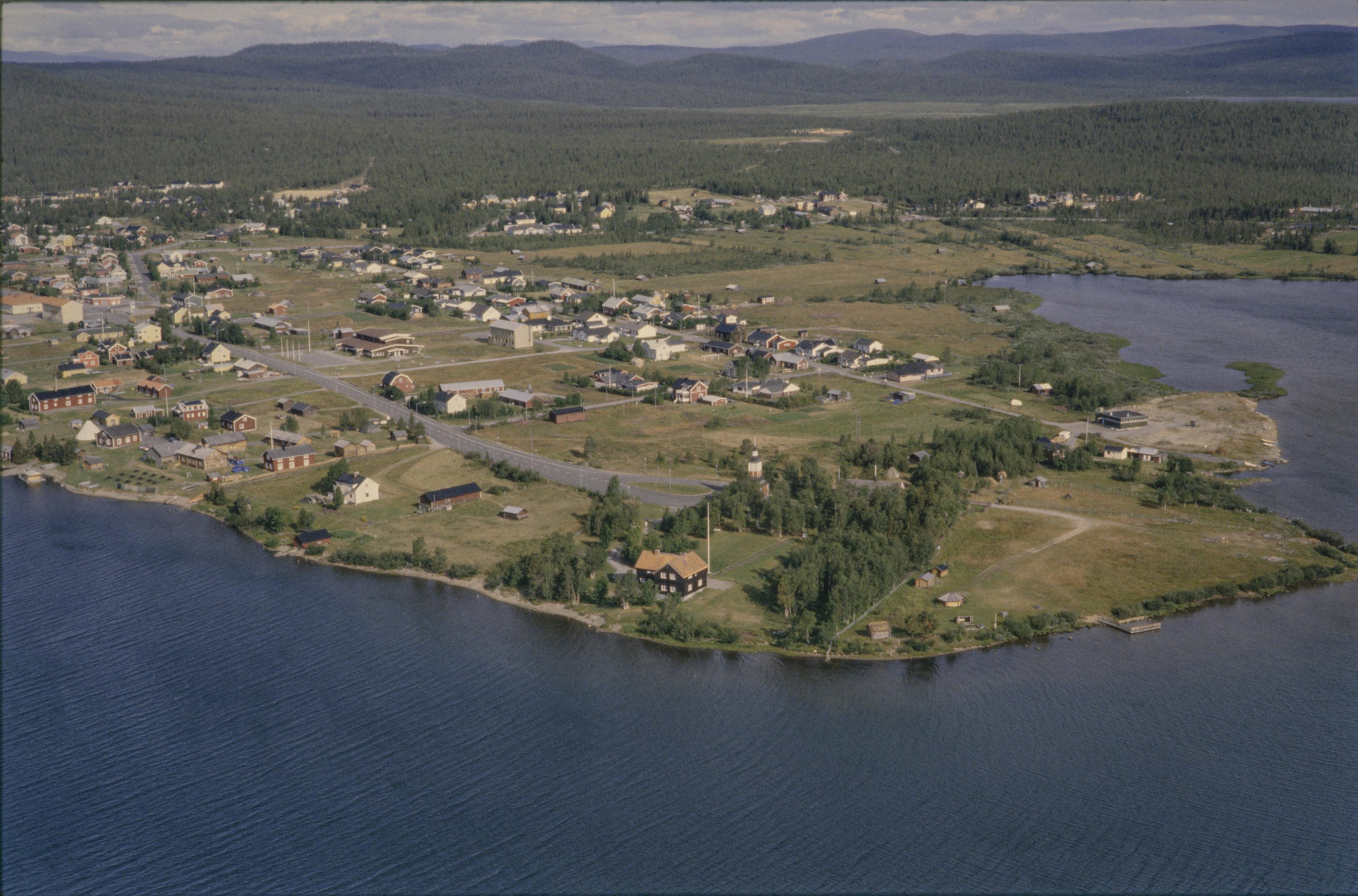 Beskrivning: Jukkasjärvi (Cohkkiras) kyrkby vid Torneälven (Duortnoseatnu), sjöarna Jukkasjärvi (Cohikkirasjávri) och Sautusjärvi. Till höger under bildens mitt Jukkasjärvi kyrka vid kyrkplats RAÄnr Jukkasjärvi 2516. Bilden är tagen mot (väderstreck): NV