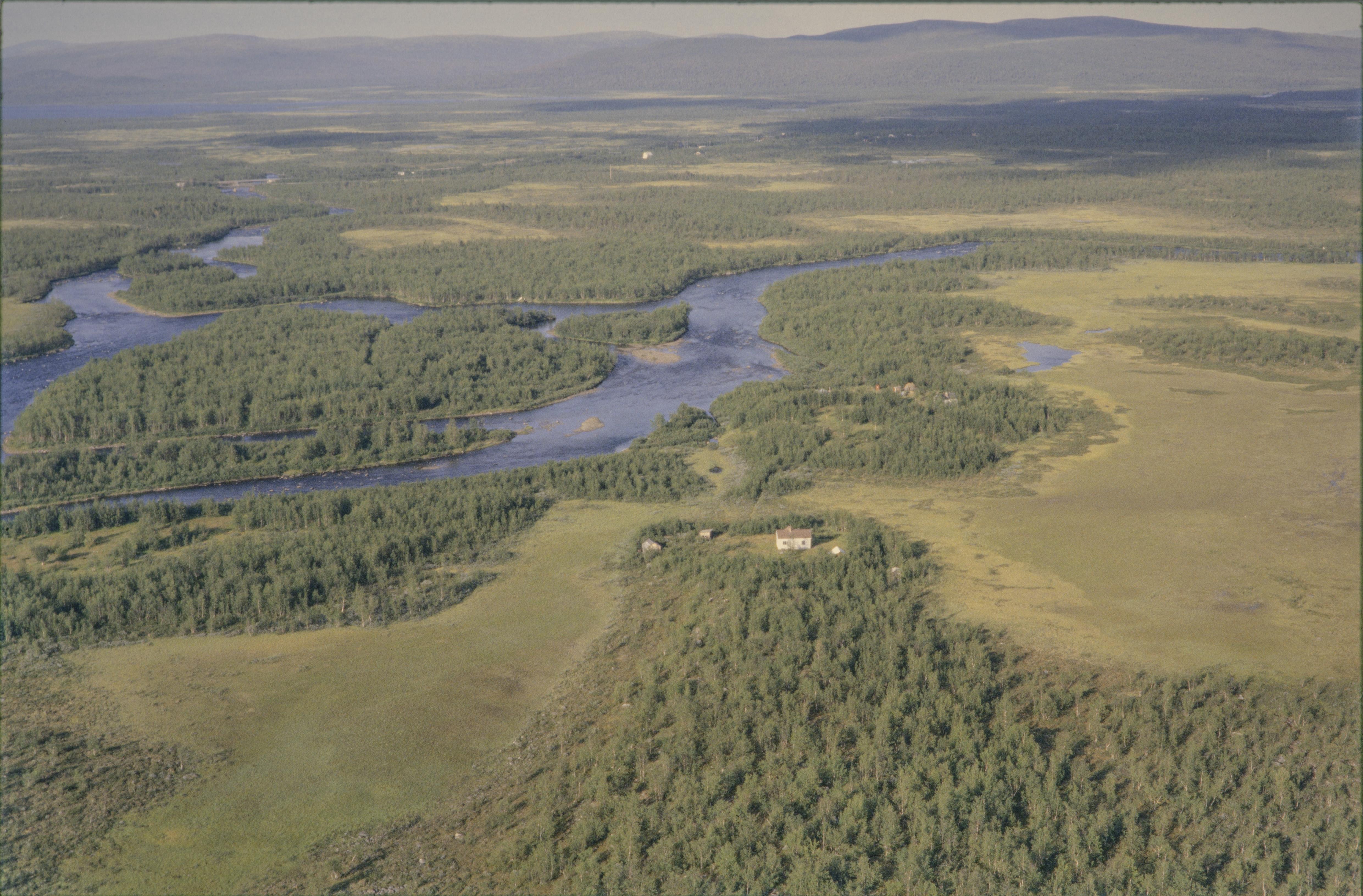 Beskrivning: Västra delen av Rautas (Rávttas) by vid Rautasälven (Rávttaseatnu). Uppe till vänster färdväg RAÄnr Jukkasjärvi 2654 vid järnvägen Ofotbanen (Ofotbanan / Malmbanan). Området ingår i Gabna sameby och Rautas fjällurskogs naturreservat. Bilden är tagen mot (väderstreck): NO