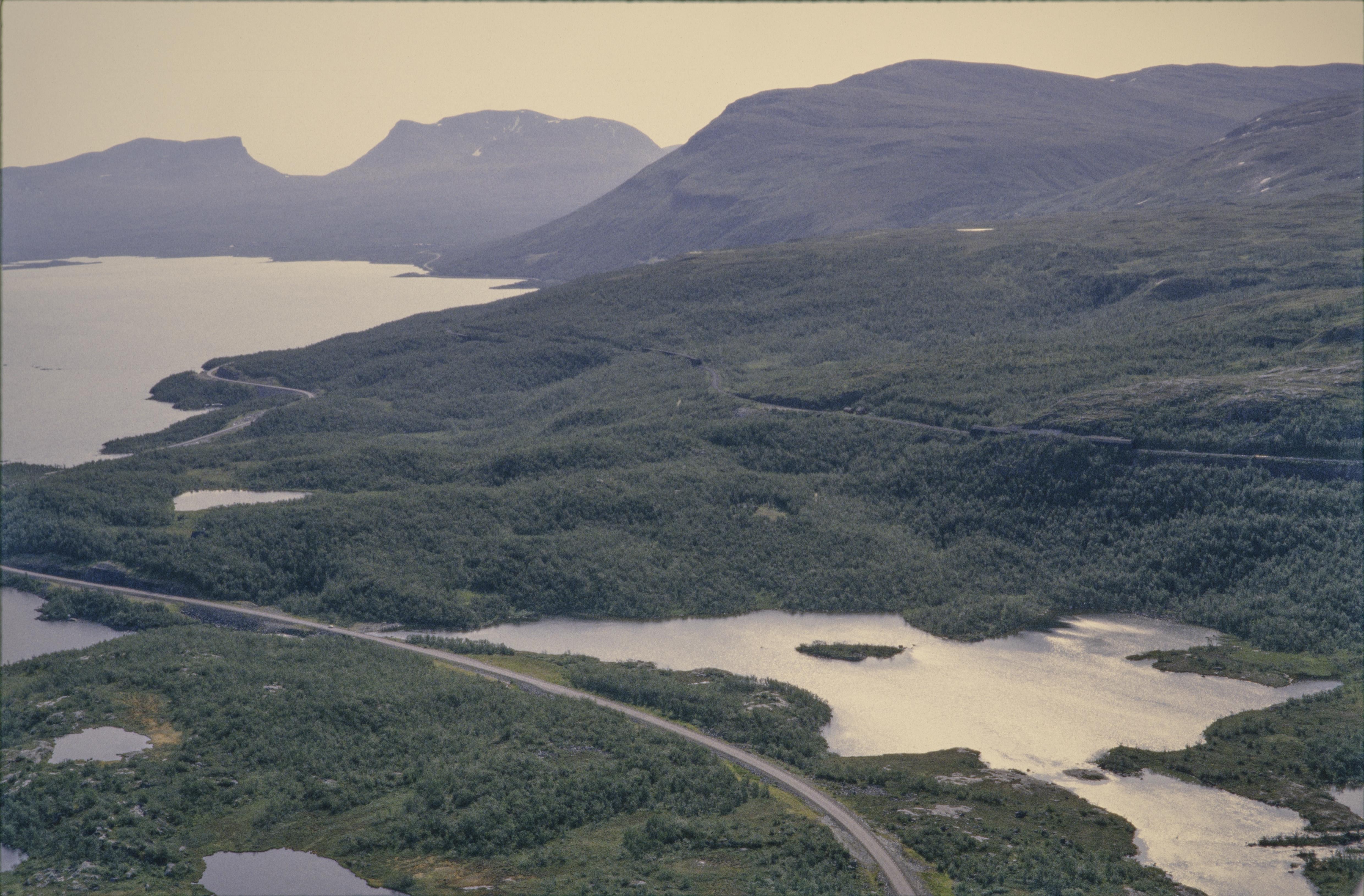 Beskrivning: Tornehamns by vid sjön Torneträsk (Duortnosjávri). Järnvägen Ofotbanen (Ofotbanan / Malmbanan) och Rallarkyrkogården / Tornehamns kyrkogård uppe till höger. I skogen till vänster om bildens mitt Tornehamns kapell vid bytomt RAÄnr Jukkasjärvi 186:1. Fjällområdet Lapporten uppe till vänster. Bilden är tagen mot (väderstreck): ONO