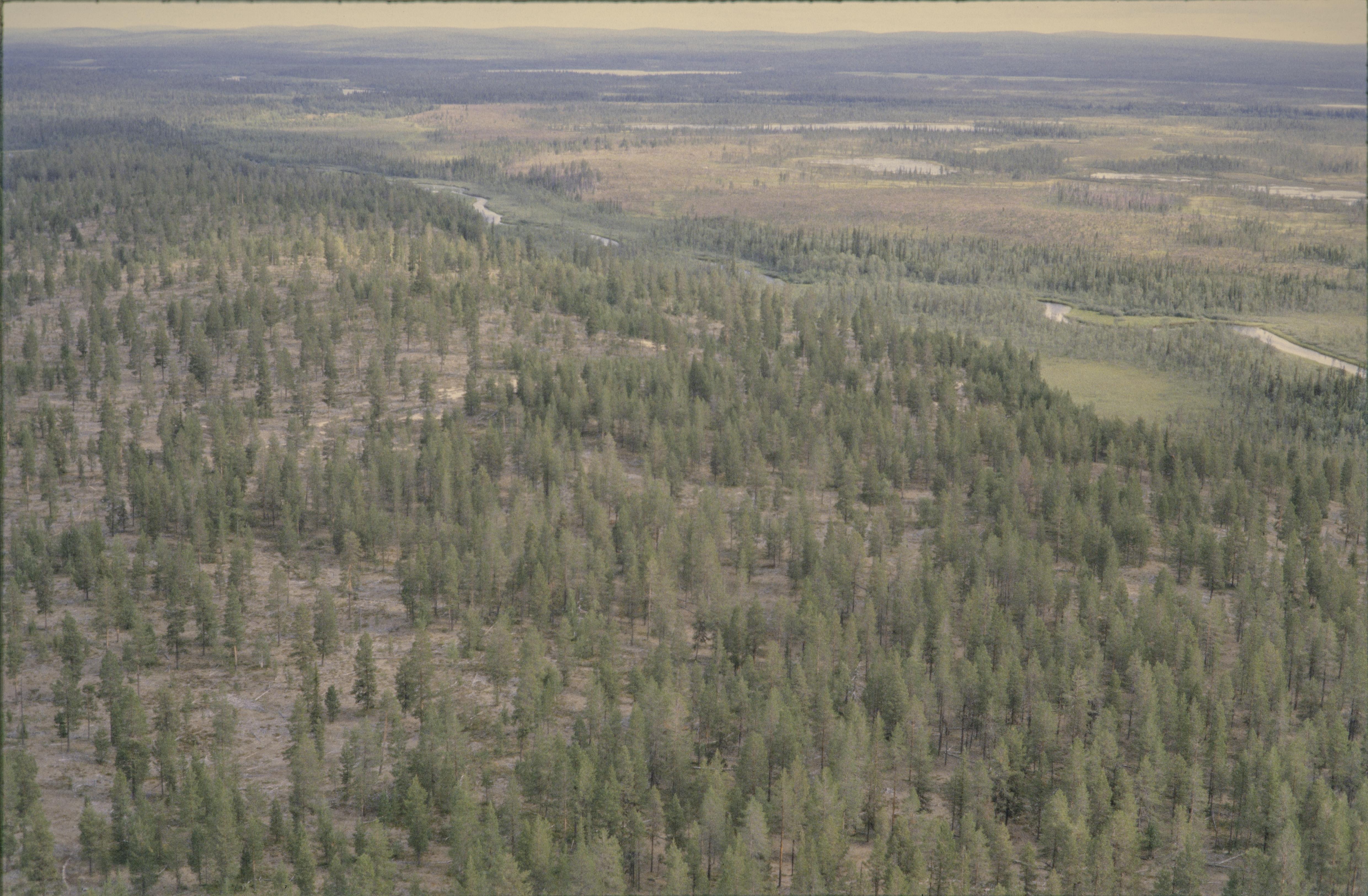 Beskrivning: Området Kaskomaa på västsidan av ån Vaikkijoki (Vaihkojoki). Vid bildens mitt fångstgropssystem RAÄnr Jukkasjärvi 17:1, boplats Jukkasjärvi 775:1, 781:1, m.m. Bilden är tagen mot (väderstreck): NO