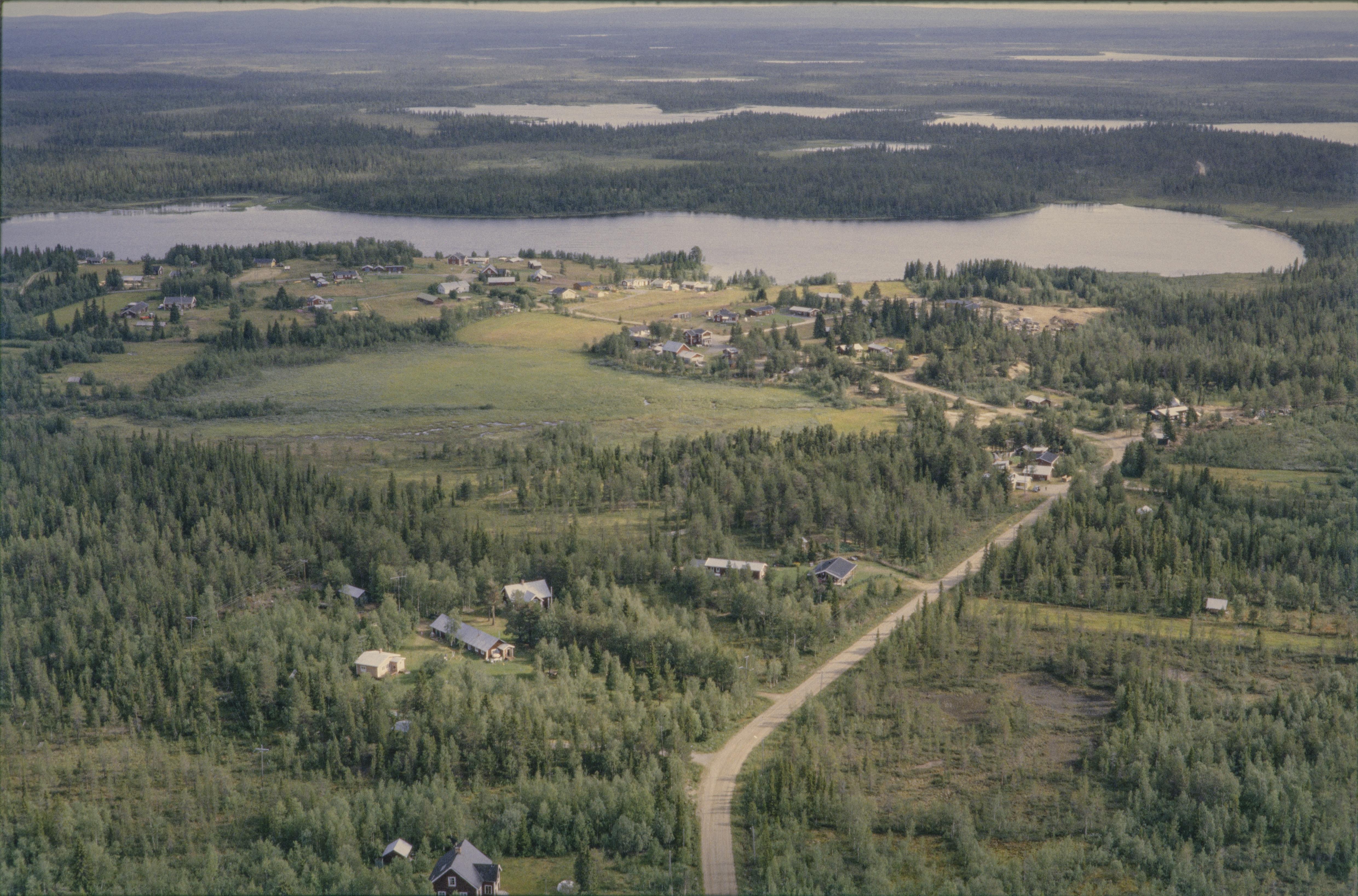 Beskrivning: Vivungi (Vivunki / Viivvuk) by. Över bildens mitt sjön Vivunkijärvi (Viivvukjávri). Vid sjön nordöstra strand (över bildens mitt) boplats RAÄnr Jukkasjärvi 714:1, 715:1, m.m. I bildens övre del sjön Vaikkojärvi (Vaihkojärvi) och ån Vaikkijoki (Vaihkojoki) med fångstgropar. Bilden är tagen mot (väderstreck): NO