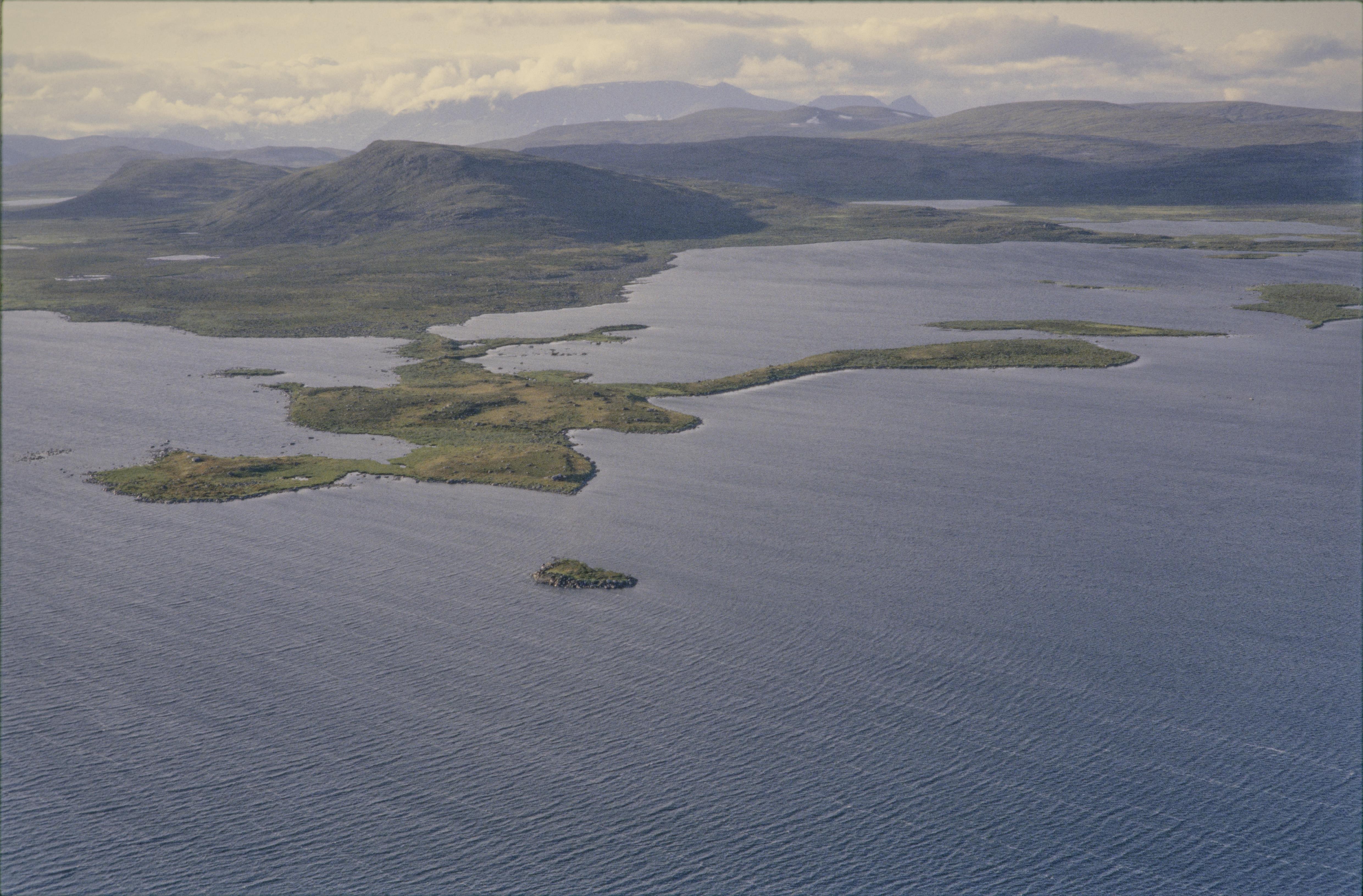 Beskrivning: Sjön Råstojaure (Rostojávri / Rostojärvi). Udden Seiddenjarga (Sieiddinjárga) vid norra stranden. På holmen under bildens mitt offerplats RAÄnr Karesuando 7:1. Bilden är tagen mot (väderstreck): NV