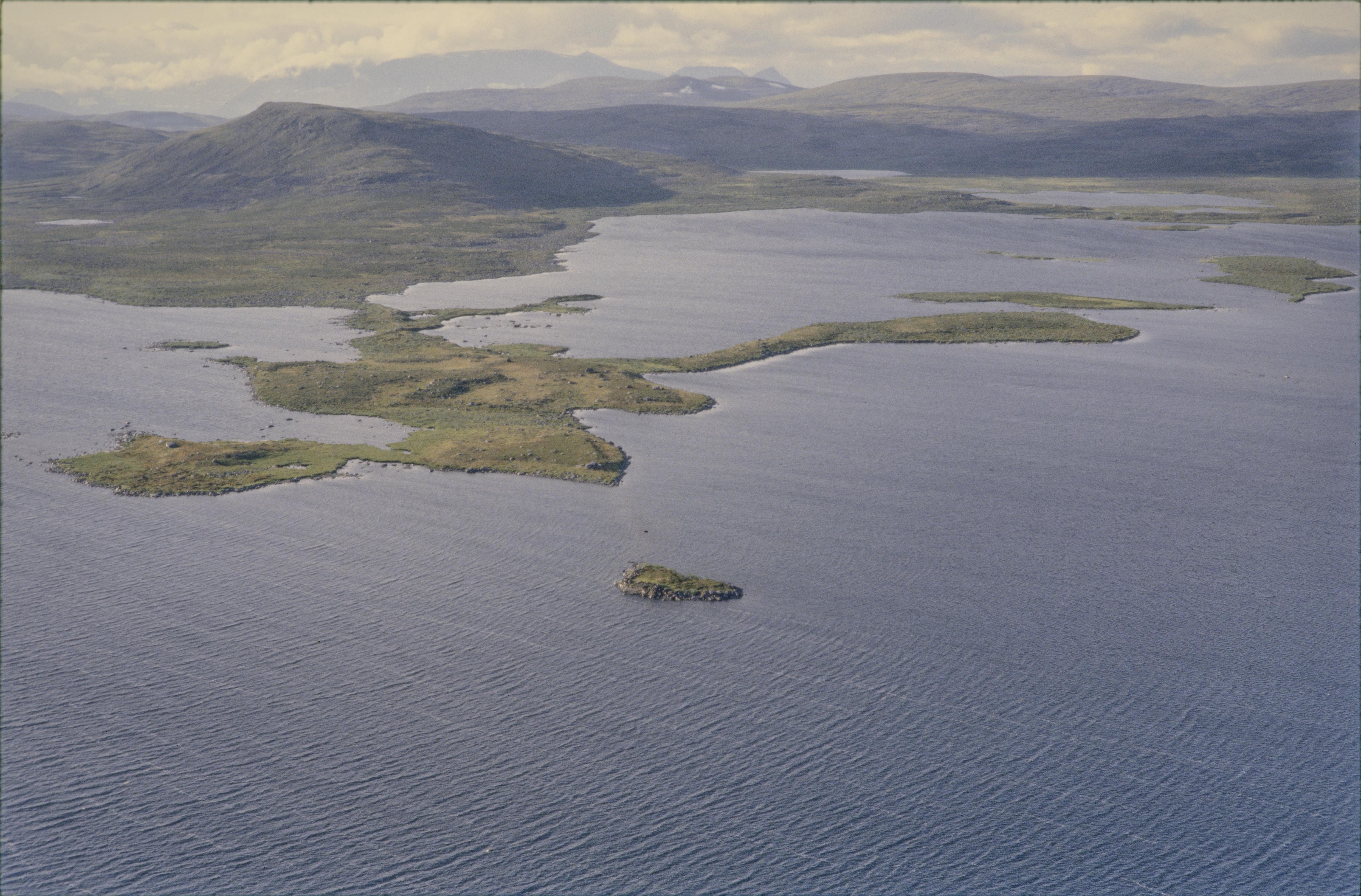 Beskrivning: Sjön Råstojaure (Rostojávri / Rostojärvi). Udden Seiddenjarga (Sieiddinjárga) vid norra stranden. På holmen under bildens mitt offerplats RAÄnr Karesuando 7:1. Bilden är tagen mot (väderstreck): NNV