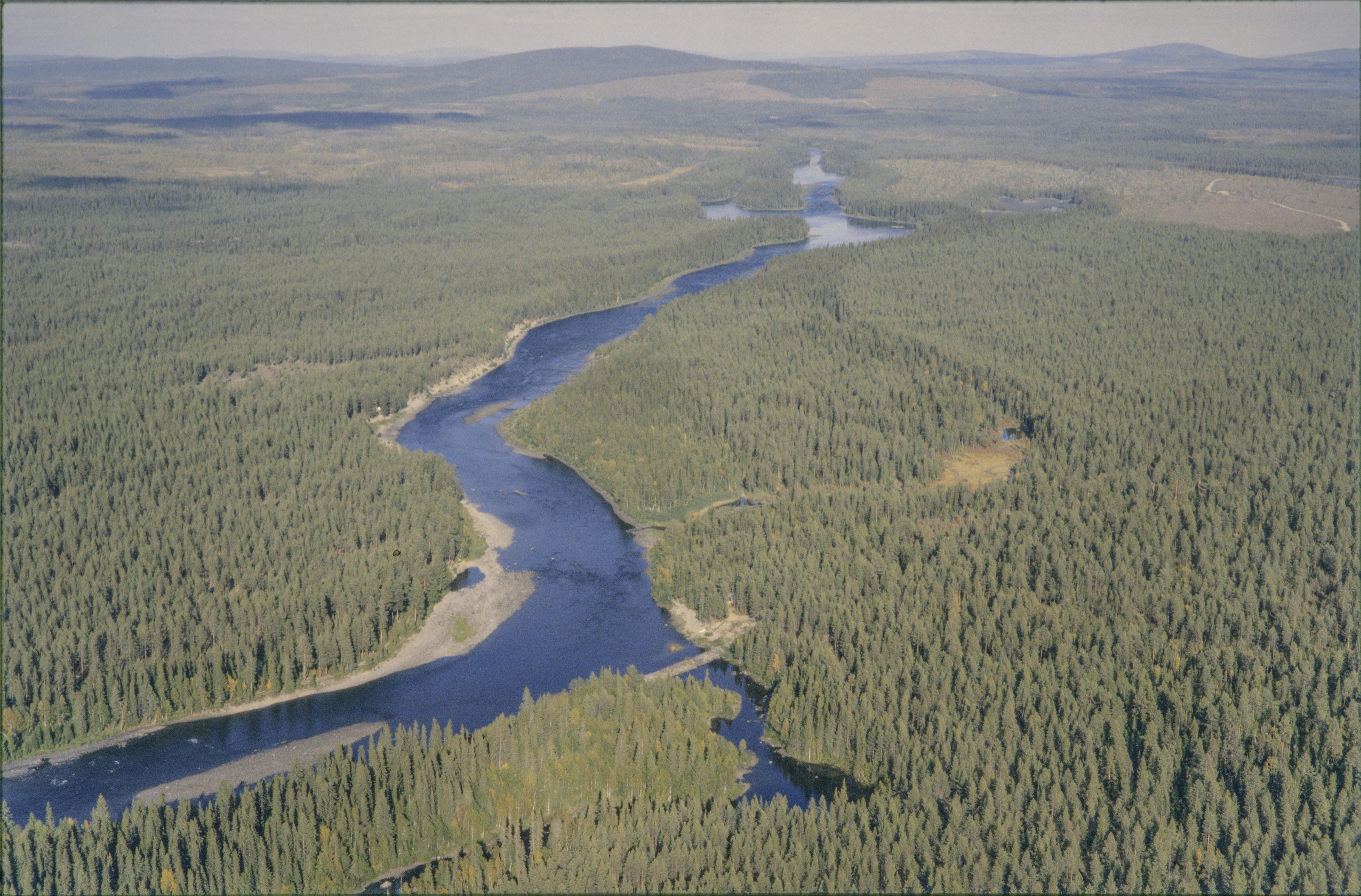 Beskrivning: Laisälven (Lájsso) vid Långforsen, i östra delen av området Laisheden. Vid älvkanten till vänster under bildens mitt boplats RAÄnr Sorsele 180:1. Till vänster över bildens mitt ett långt fångstgropssystem RAÄnr Sorsele 152:1. Bilden är tagen mot (väderstreck): NO